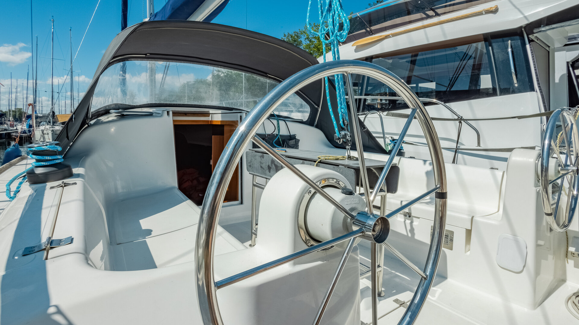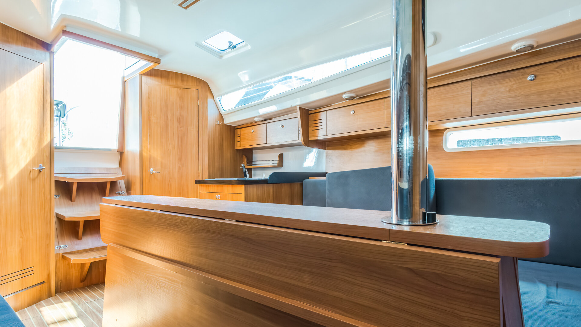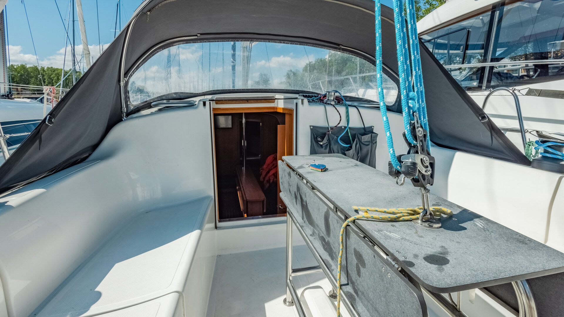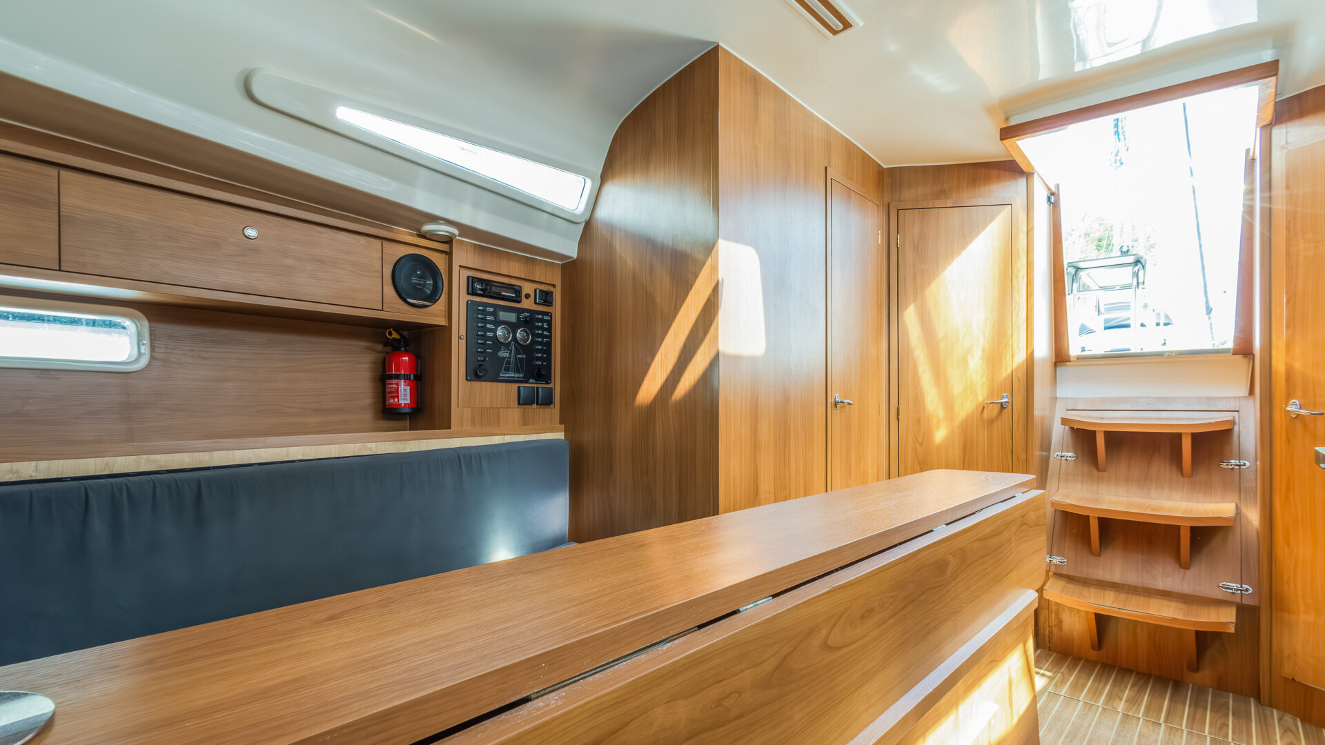 Przestronny kokpit ze stałym stolikiem posiada dwa wydzielone stanowiska dla sternika. Asymetryczna zejściówka ułatwia obsługę takielunku oraz pozwala na lepsze zagospodarowanie wewnętrznej przestrzeni jachtu. Trzy oddzielne zamykane kabiny oraz rozkładane koje w mesie pozwalają na wygodną żeglugę nawet dla dziewięciu osób. Łazienka wyposażona jest w toaletę morską oraz kabinę prysznicową z ciepłą i zimną wodą.