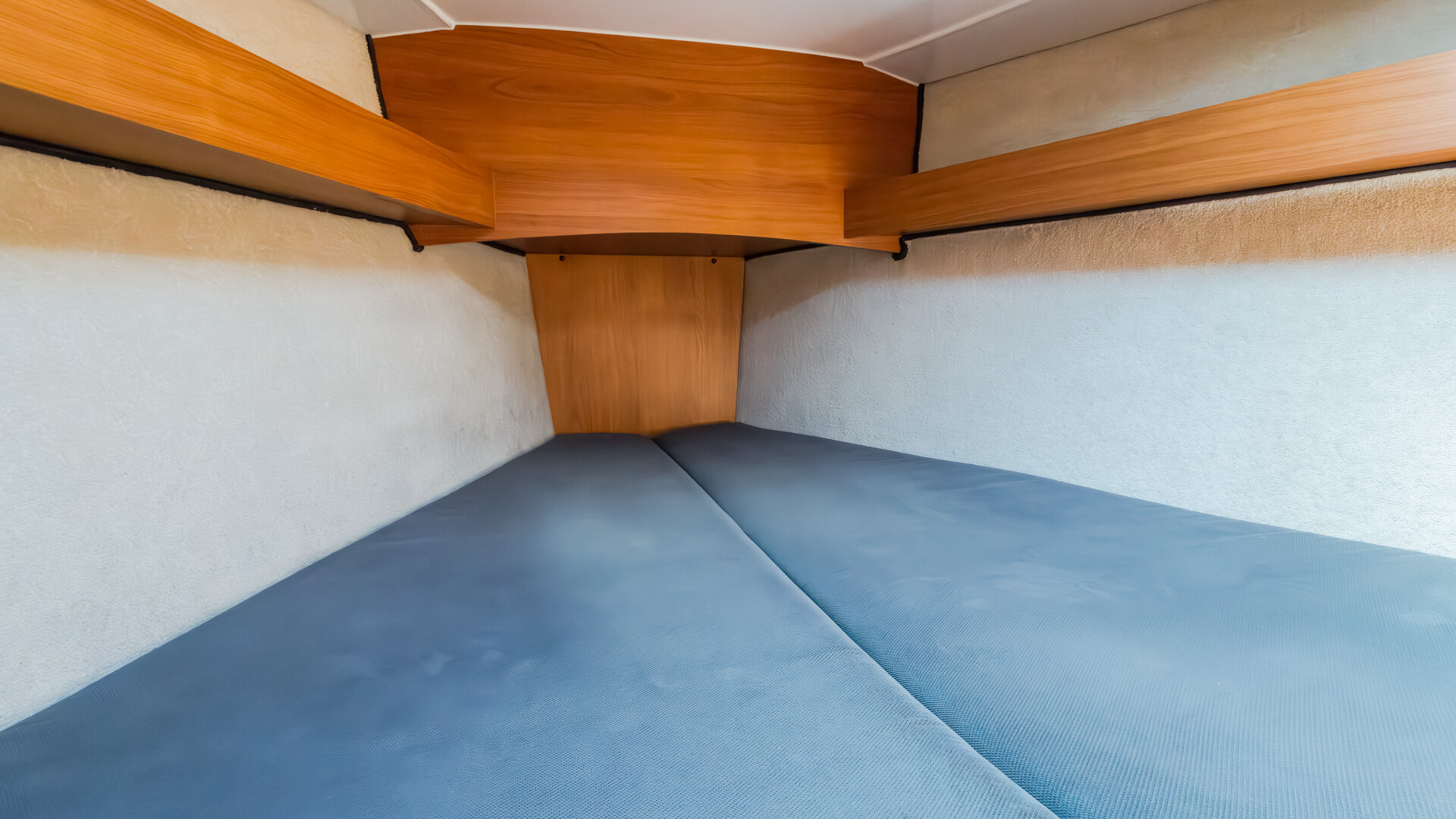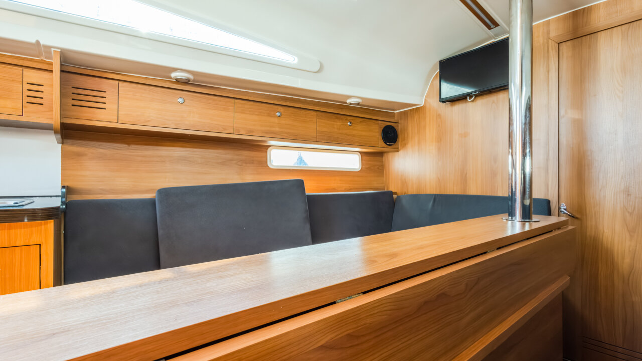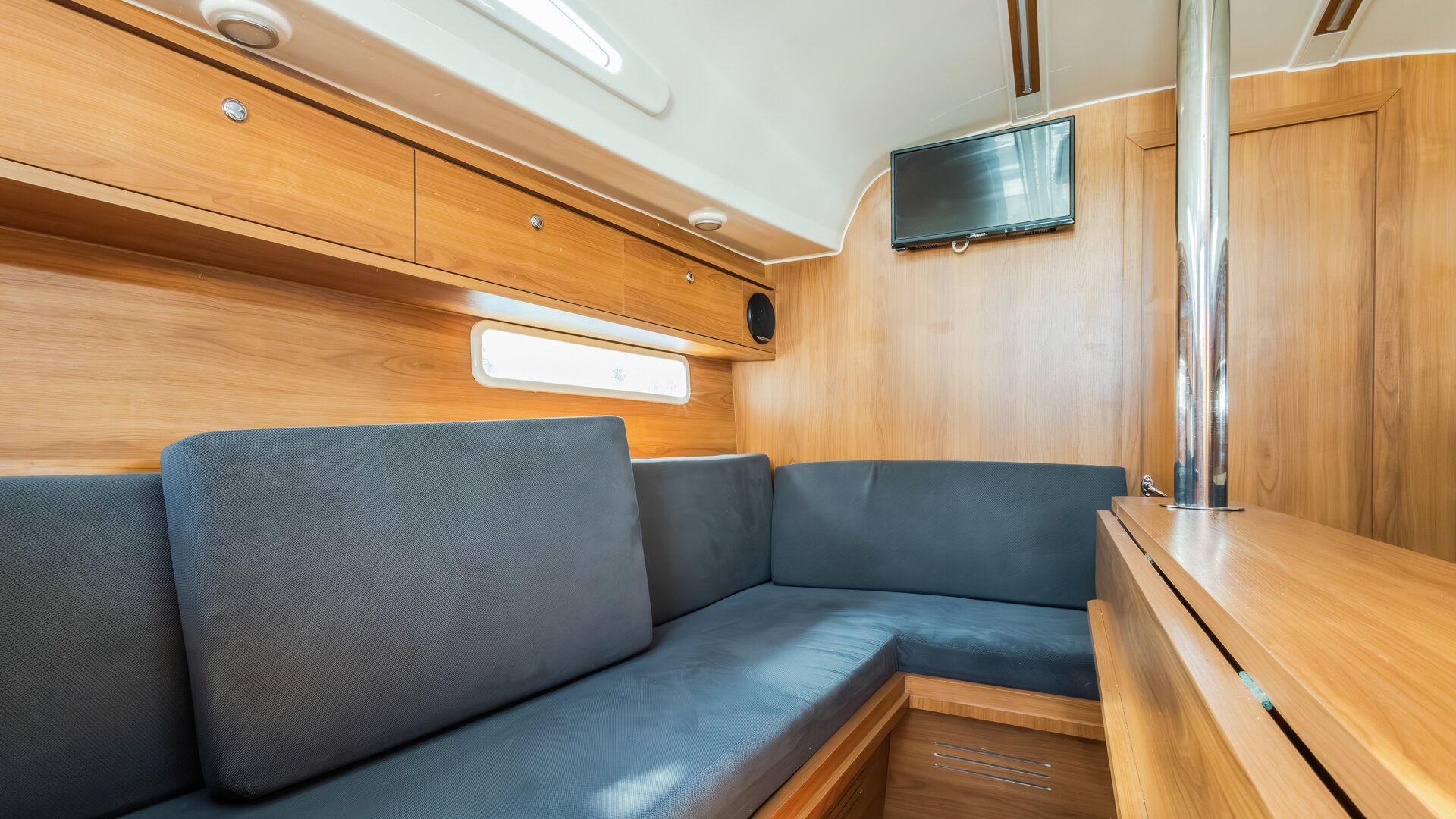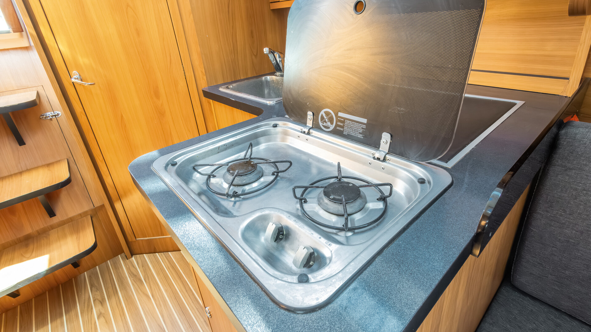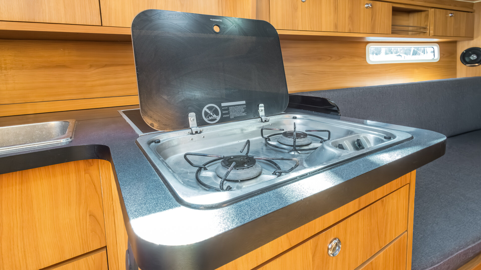 W kambuzie znajduje się dwupalnikowa kuchenka gazowa, zlew oraz otwierana od góry morska elektryczna lodówka. Wnętrze wykończone jest w ciemnym drewnie (nie wiem jakim) z materacami w kolorze granatowym.