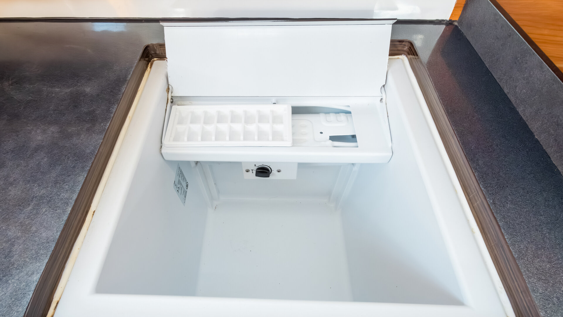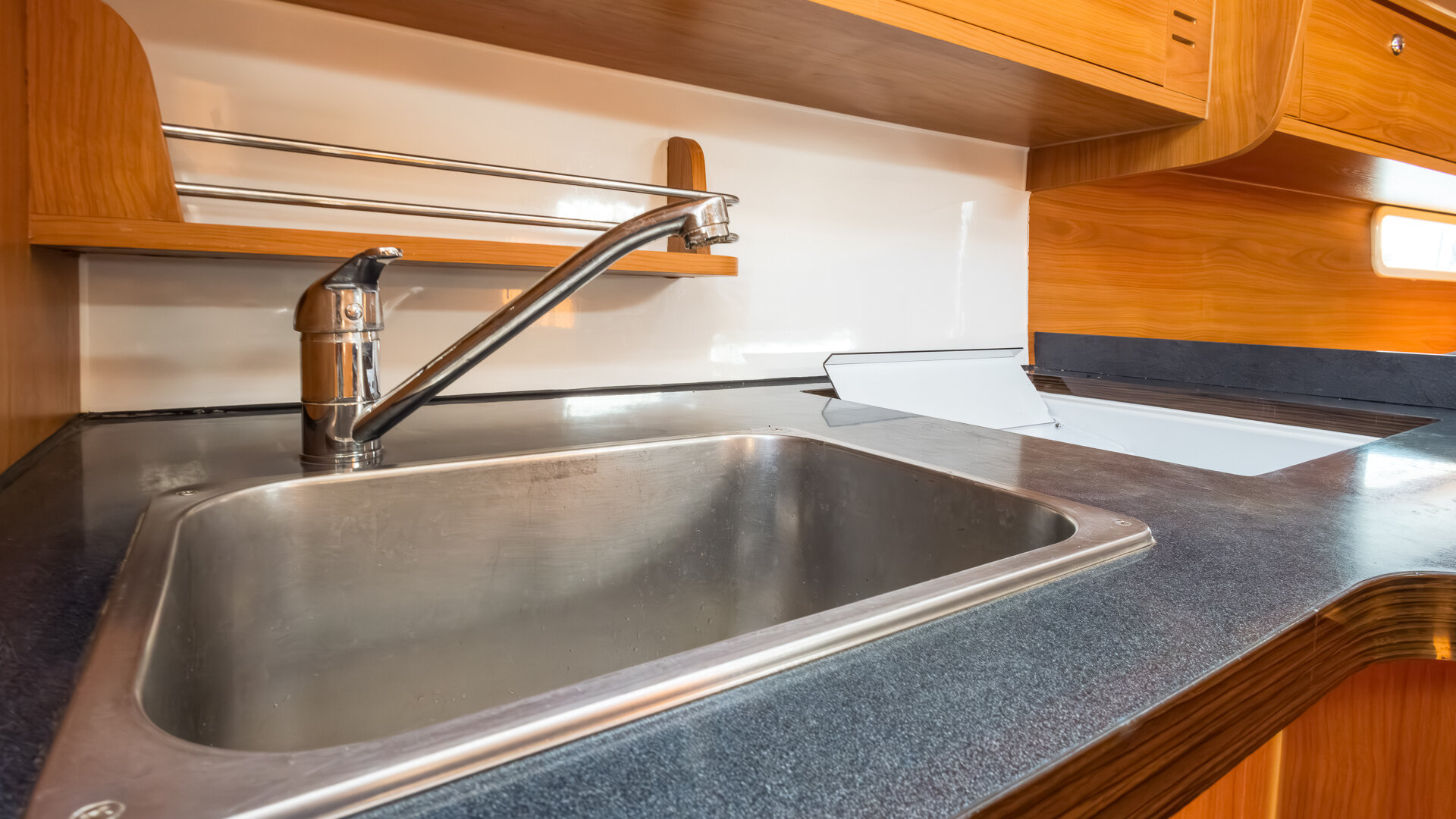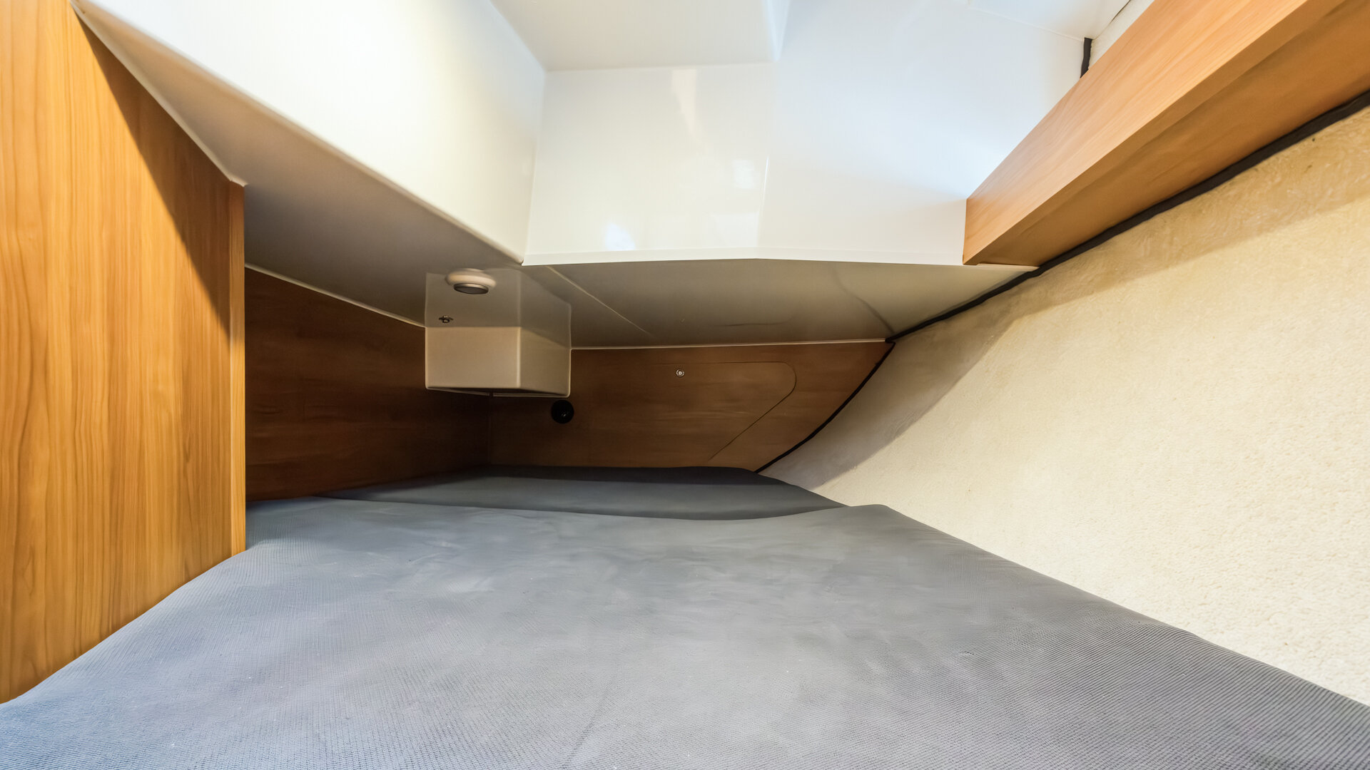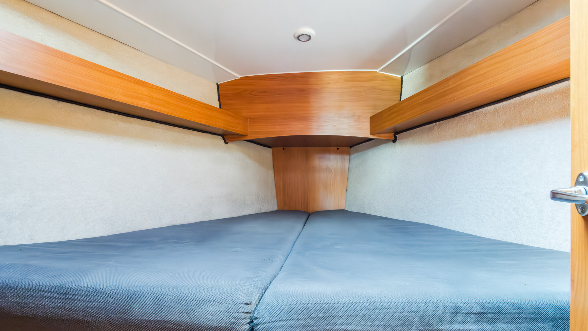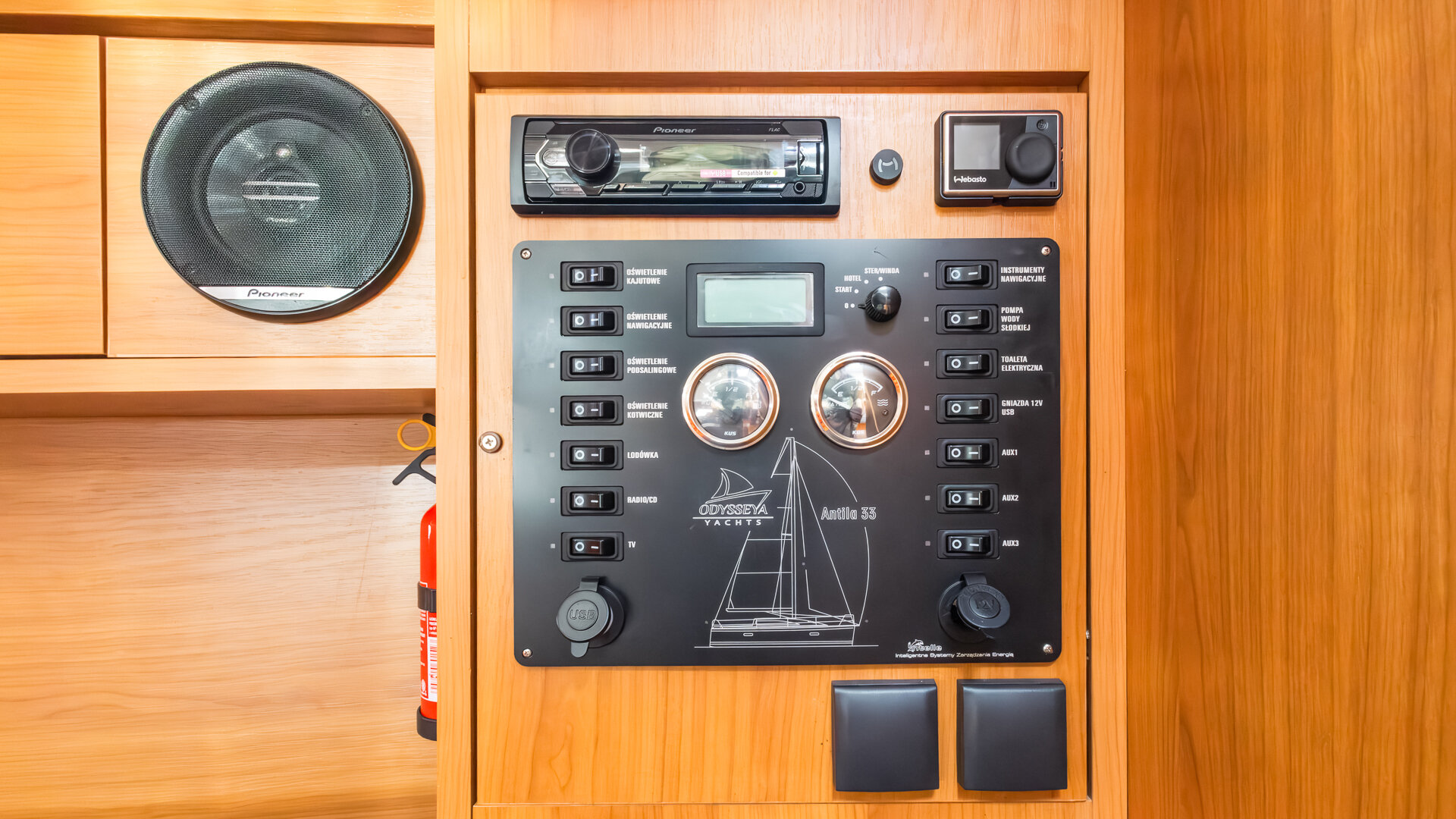 W kambuzie znajduje się dwupalnikowa kuchenka gazowa, zlew oraz otwierana od góry morska elektryczna lodówka. Wnętrze wykończone jest w ciemnym drewnie (nie wiem jakim) z materacami w kolorze granatowym.