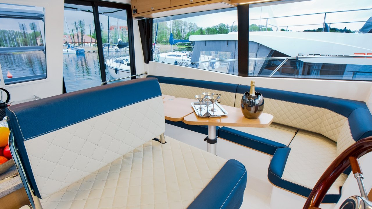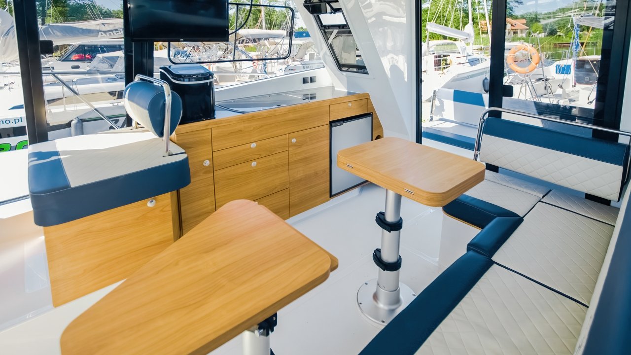 to pierwszy półślizgowy jacht, w którym przestrzeń wewnętrzna została podzielona na część nocną i dzienną. Część dzienna to kokpit salonowy otoczony przejrzystymi panoramicznymi oknami zapewniającymi świetną widoczność. Znajdą tutaj Państwo przestronny kambuz, wyposażony w zamykaną, dwupalnikową kuchenkę gazową, pojemną lodówkę z zamrażarką oraz zlewozmywak. W szafkach i szufladach pomieszczą się wszystkie niezbędne napoje oraz prowiant dla całej załogi. Na przeciwnej burcie znajduje się wygodne miejsce do siedzenia z kanapą w kształcie litery „U” oraz rozkładanym teleskopowym stolikiem, który może służyć jako dodatkowa koja. Obok kambuza usytuowane jest miejsce dla sternika, z wygodnym dwuosobowym regulowanym siedziskiem oraz bezpośrednim bocznym wyjściem na pokład, dającym dobrą widoczność oraz możliwość komunikacji z załogą na pokładzie. Sama sterówka wyposażona jest w najwyższej klasy przyrządy nawigacyjne oraz sterowe. Znajdują się tam również panele umożliwiające sterowanie wszystkimi systemami i urządzeniami jak, lampy nawigacyjne, szperacz czy winda kotwiczna.