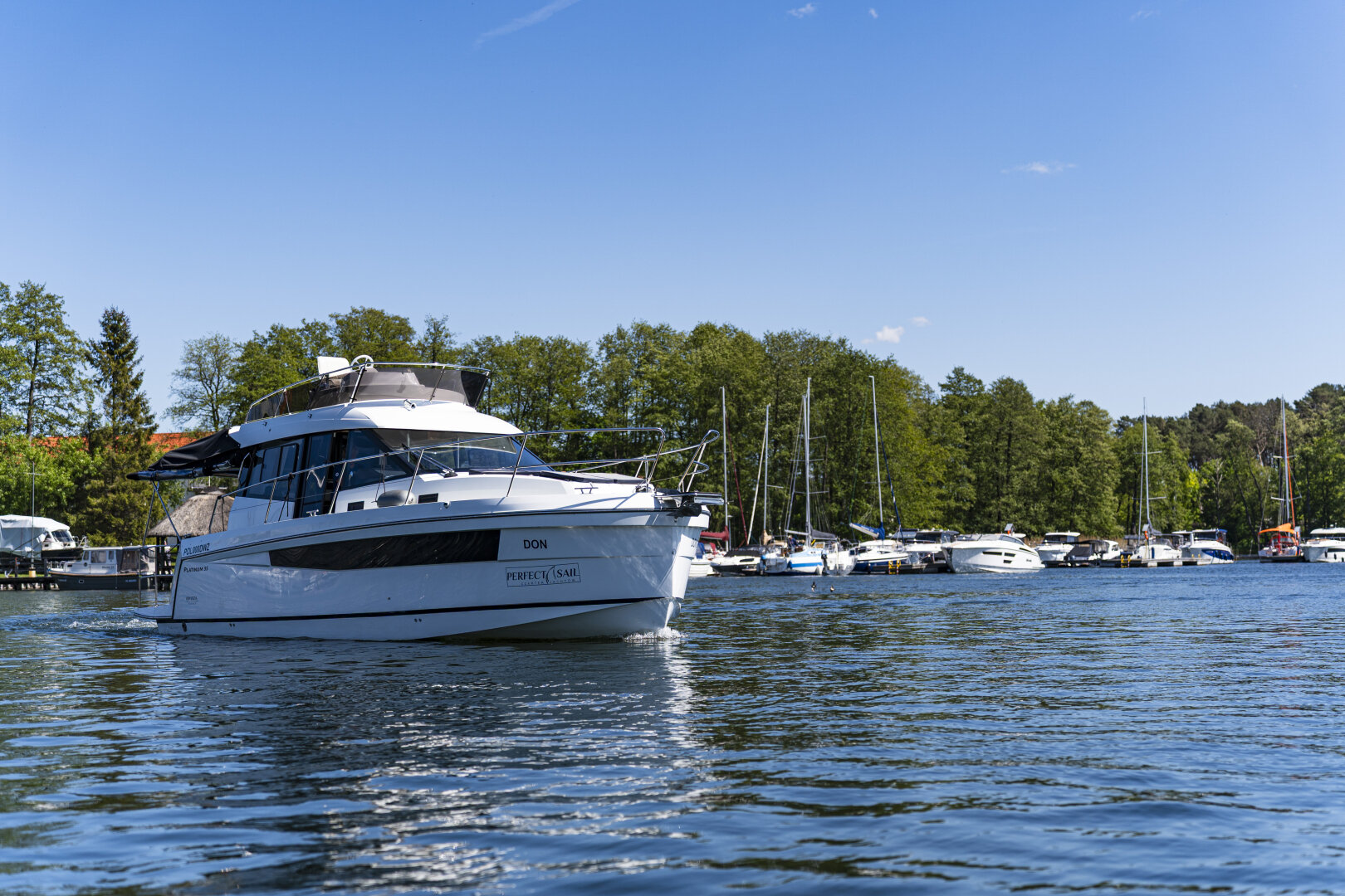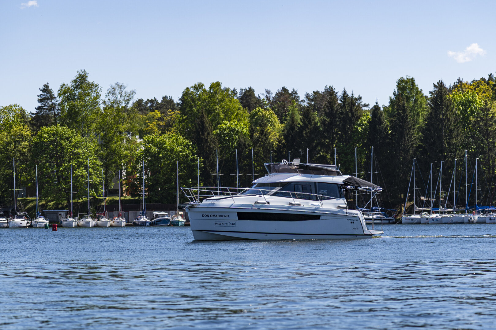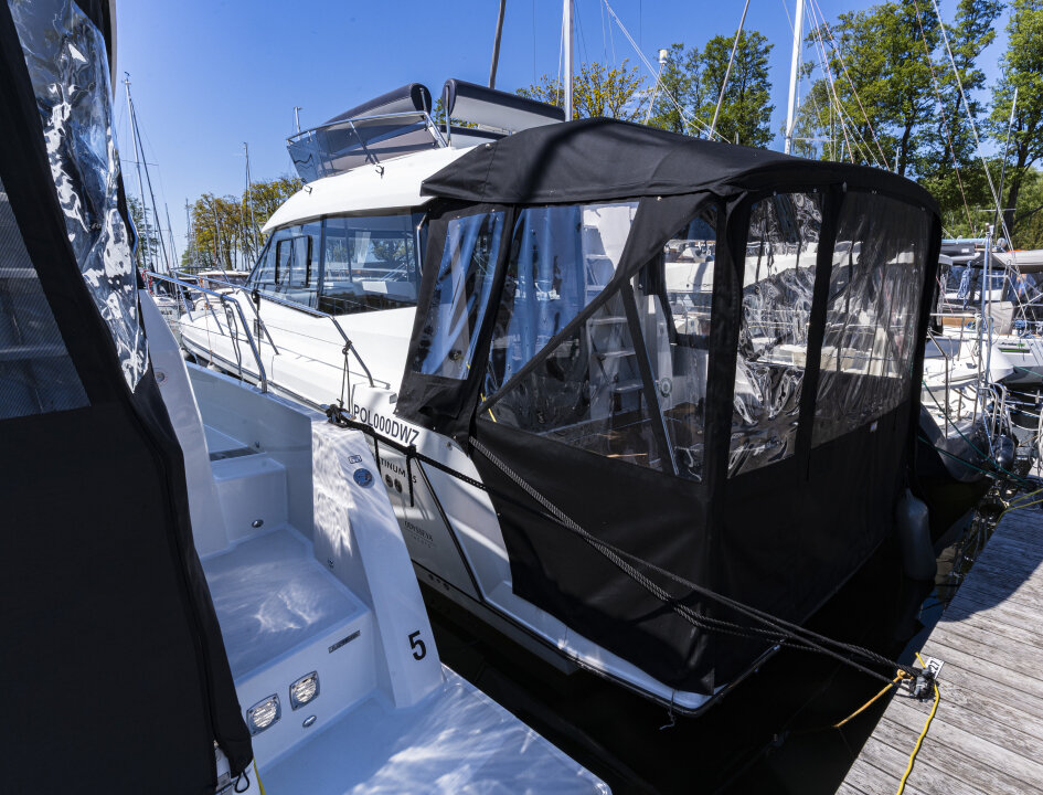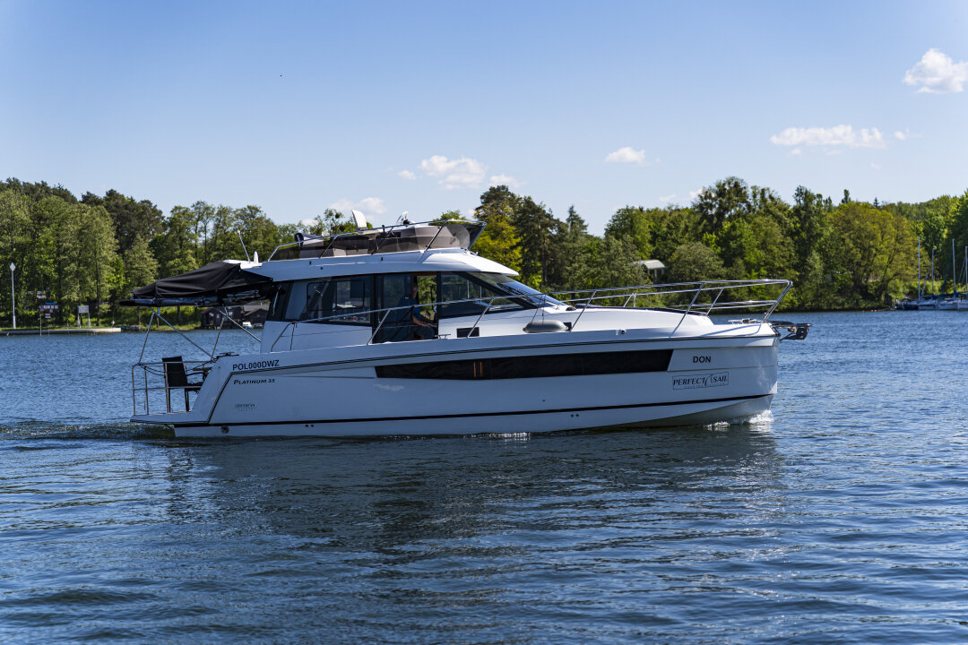 Platinum 35 Fly Active IV – Exclusive "Don Omadreno" to komfortowy jacht półślizgowy dla 8–10 osób, idealny na rodzinne rejsy po Mazurach.