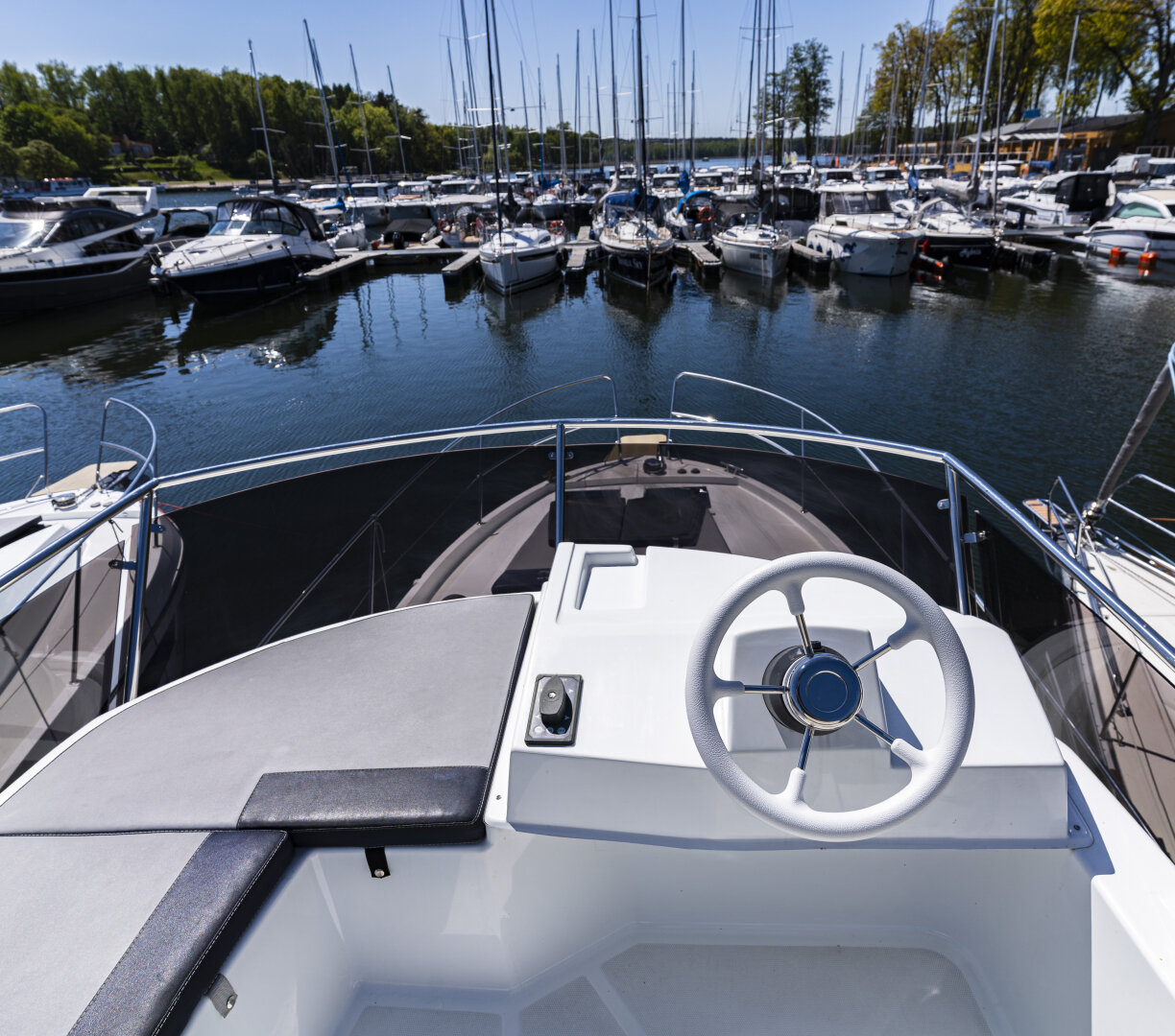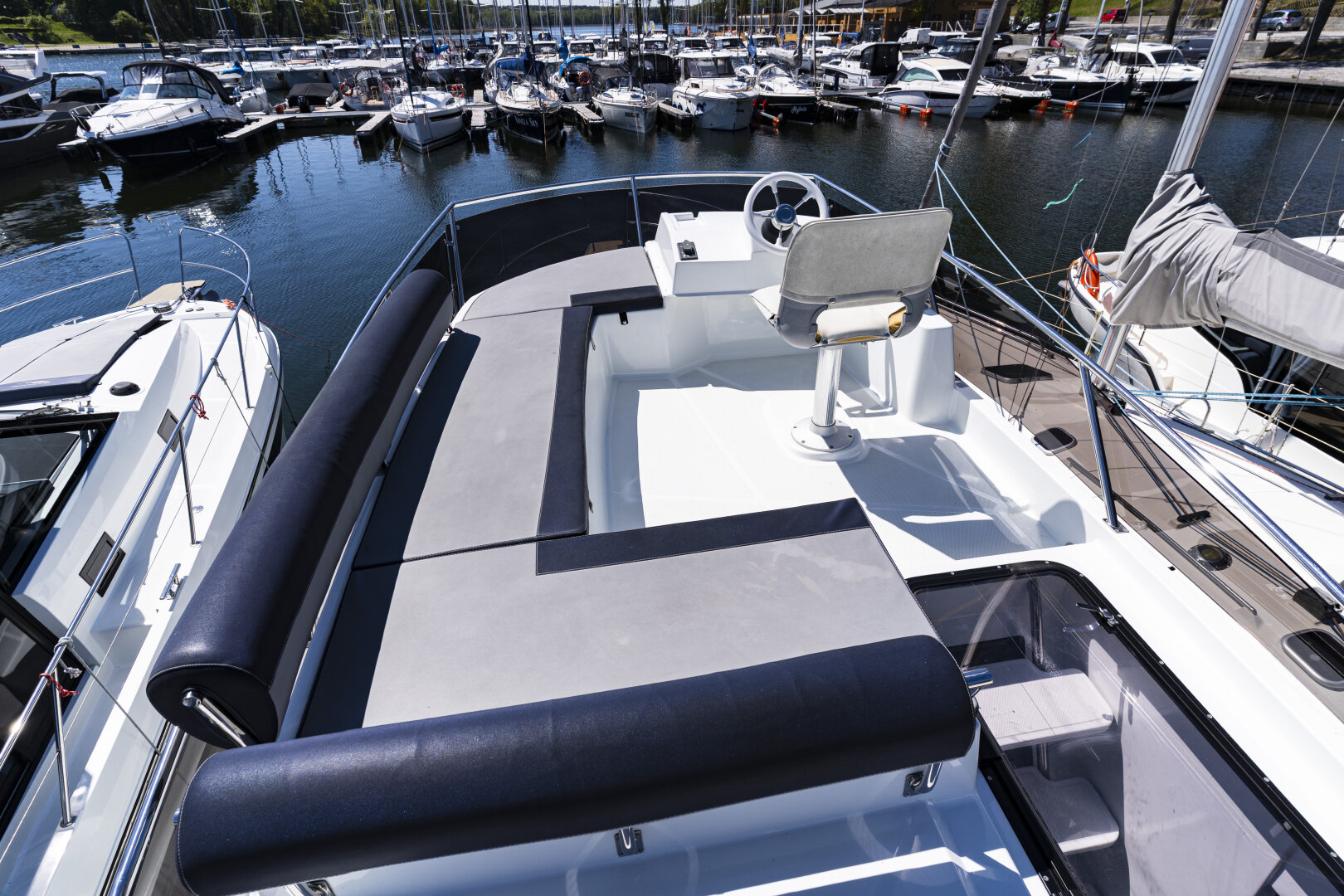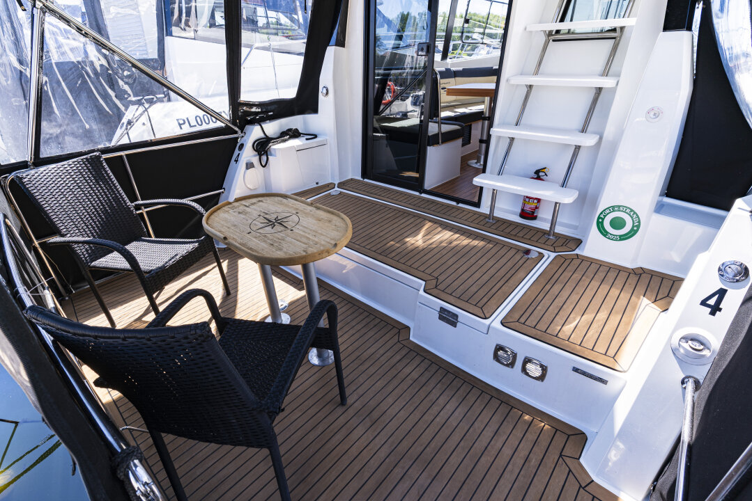 Sterówka wewnętrzna oferuje dobrą widoczność, boczne wyjście na pokład i pełne wyposażenie nawigacyjne. Dodatkowa sterówka znajduje się na Flybridge’u, który jest też strefą relaksu z kanapami i widokiem na jeziora.