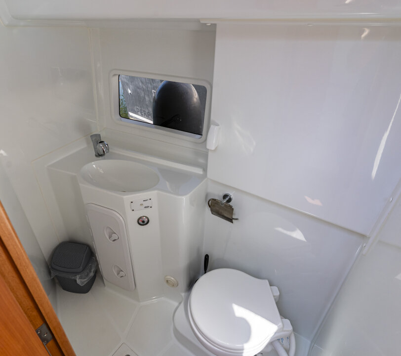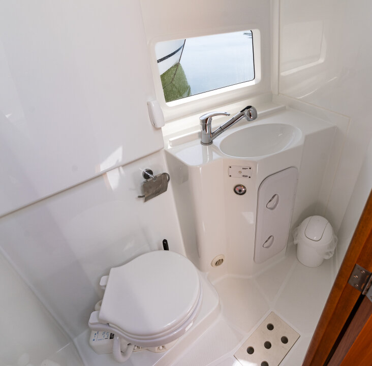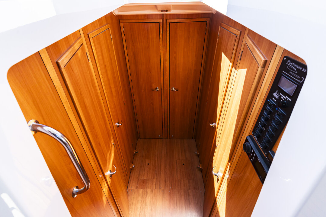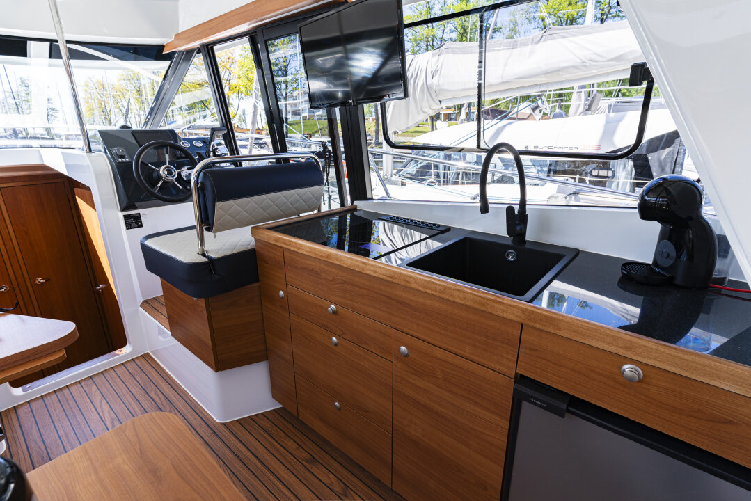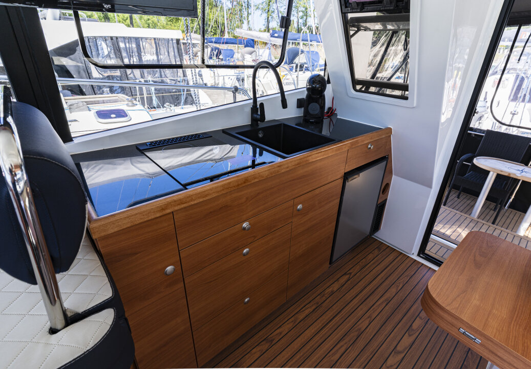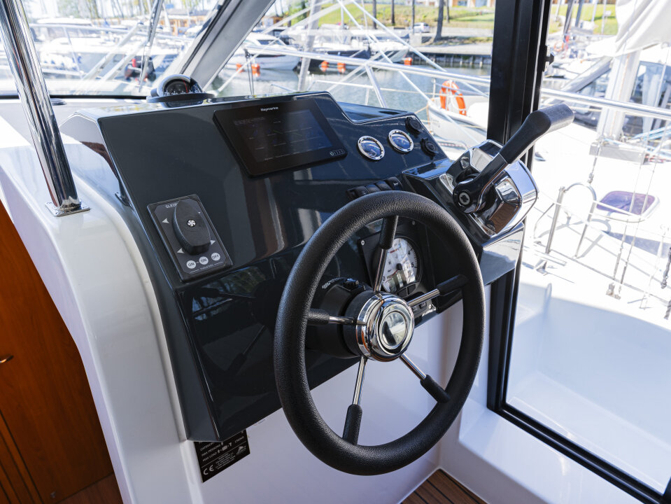Jacht prowadzi się lekko i precyzyjnie – dzięki silnikowi Yanmar 57 KM i dwóm sterom strumieniowym (dziobowy i rufowy). Ploter z mapami i głębokościomierz ułatwiają nawigację.