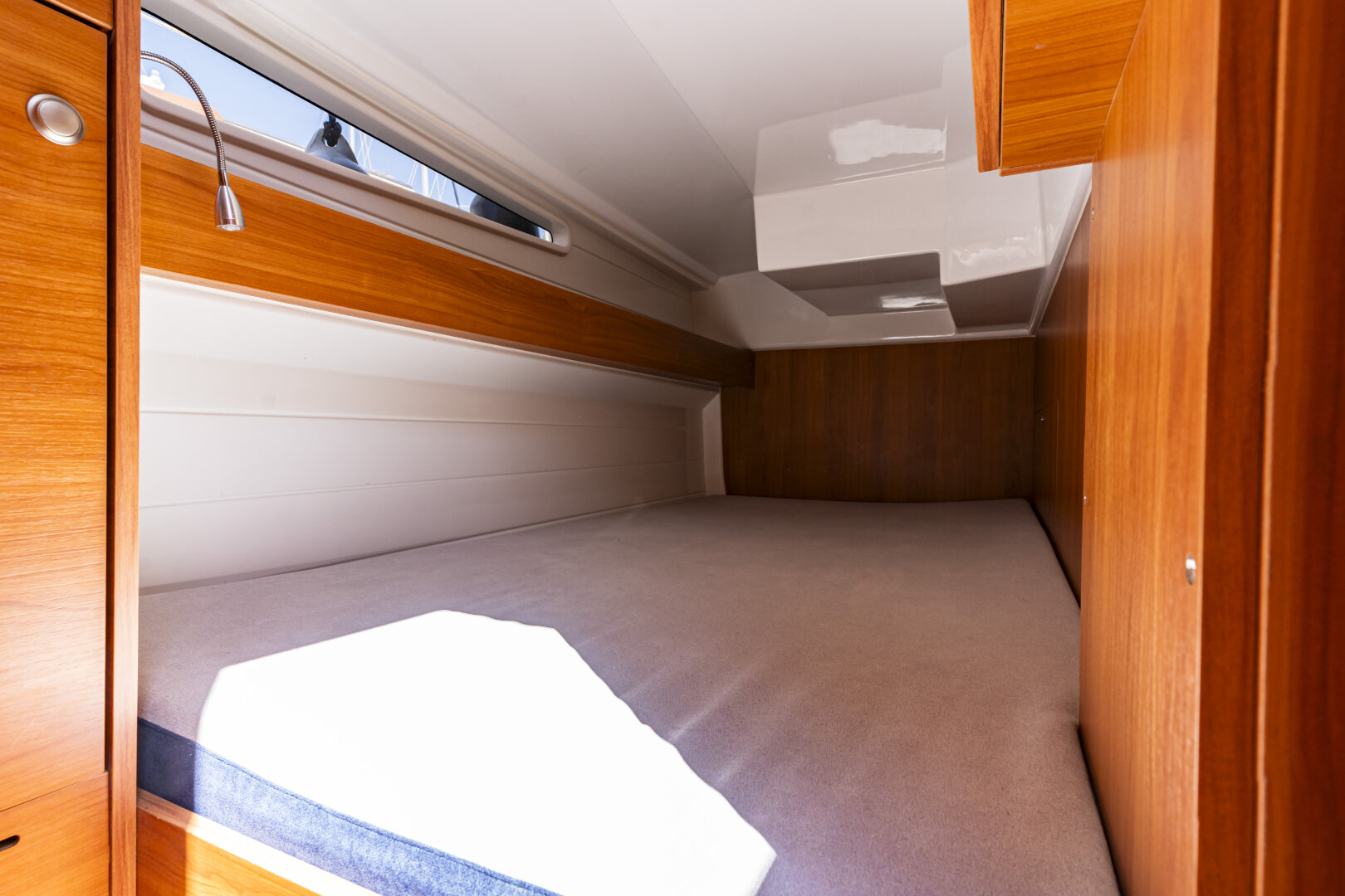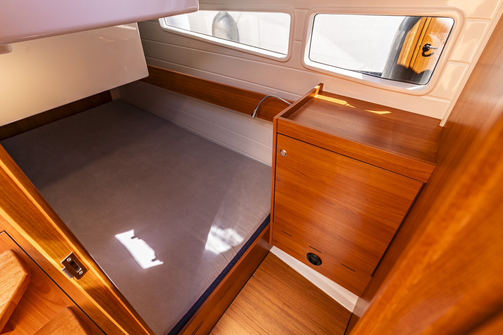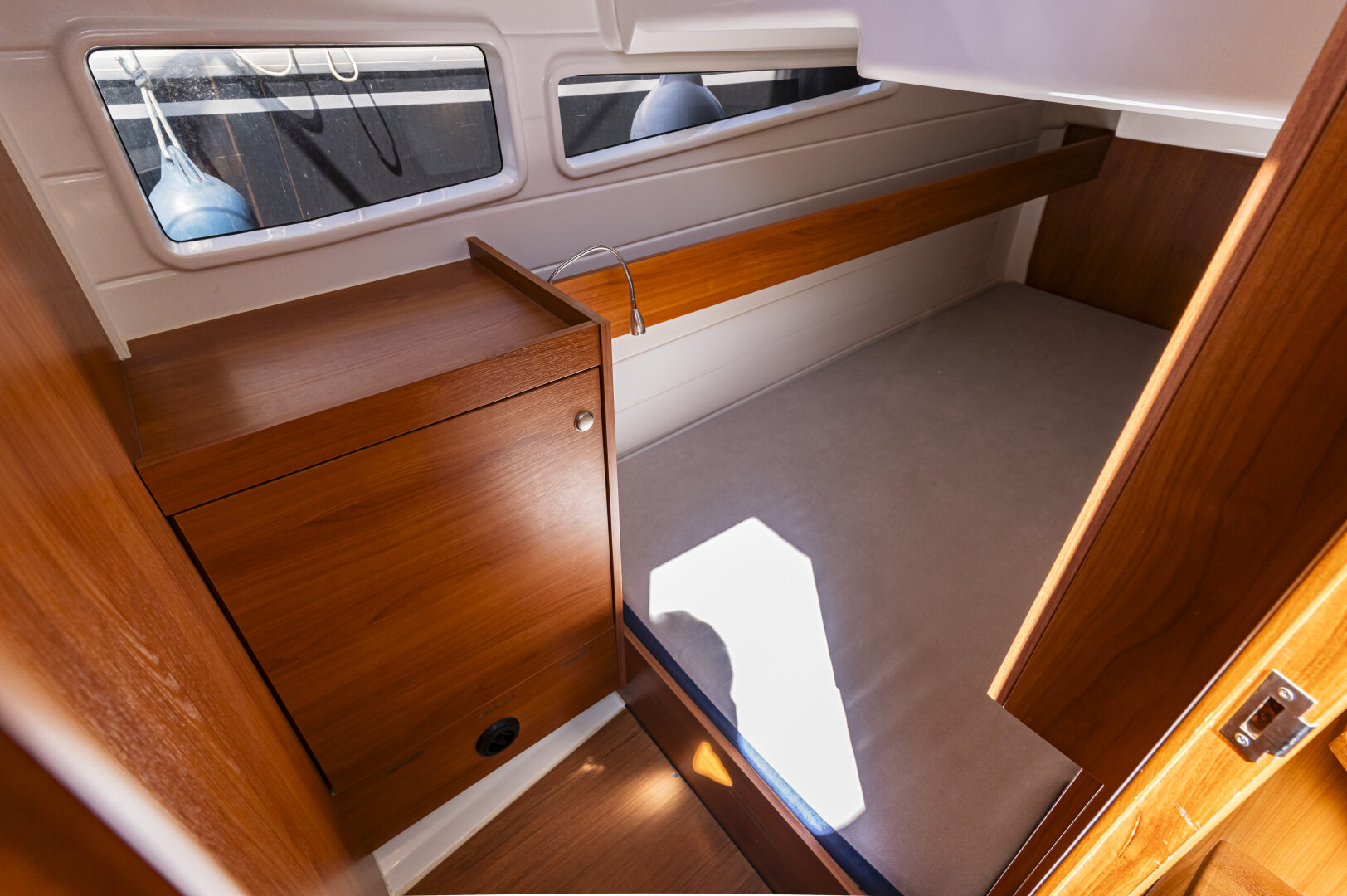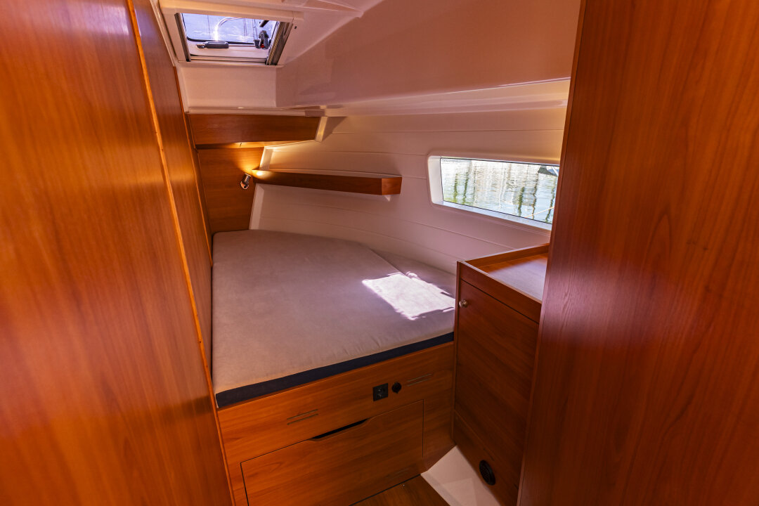 Jacht prowadzi się lekko i precyzyjnie – dzięki silnikowi Yanmar 57 KM i dwóm sterom strumieniowym (dziobowy i rufowy). Ploter z mapami i głębokościomierz ułatwiają nawigację.