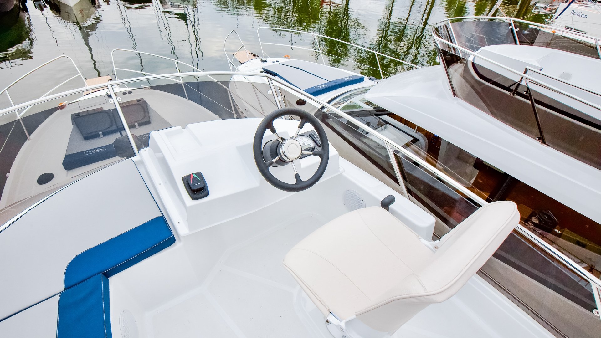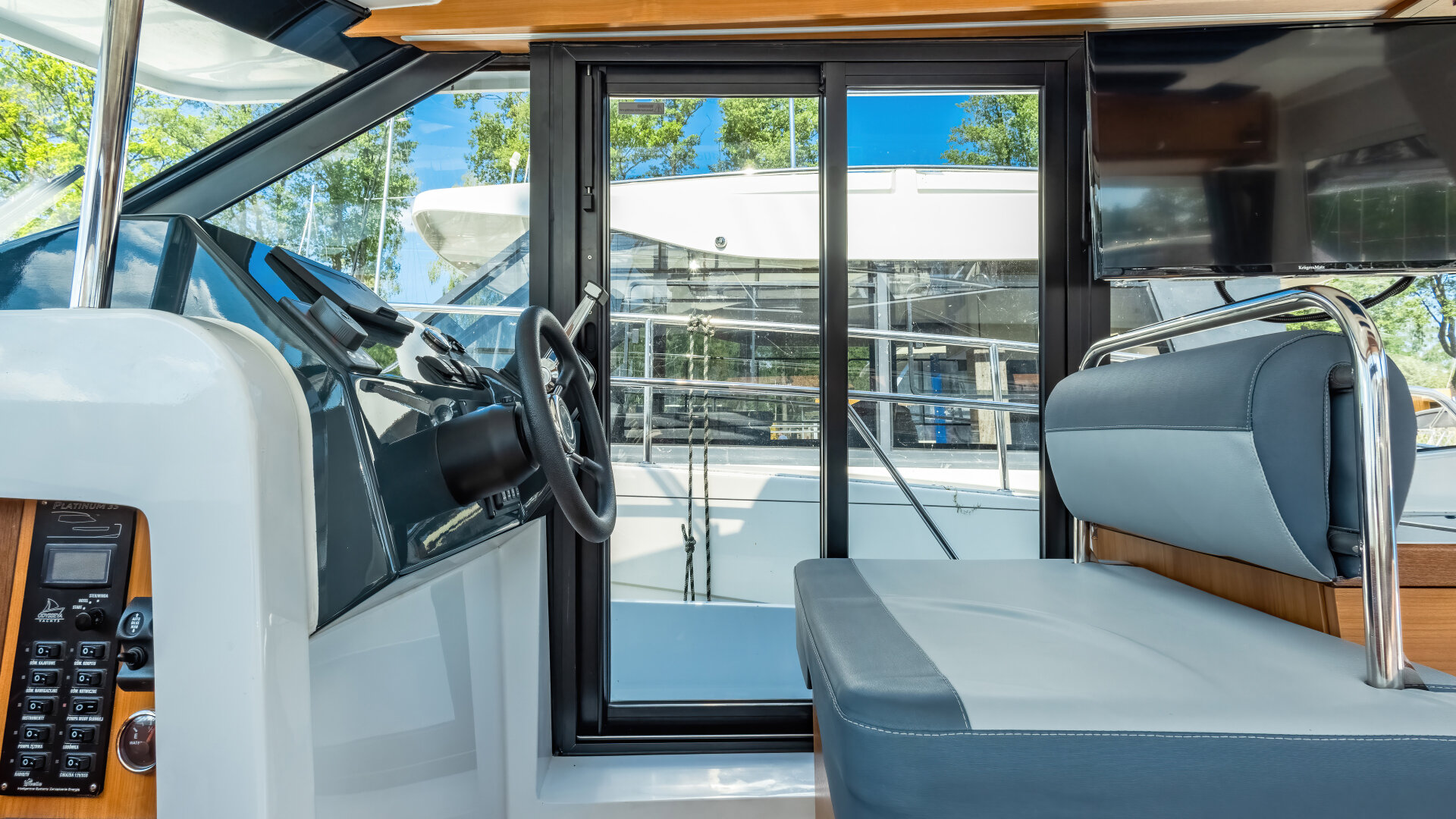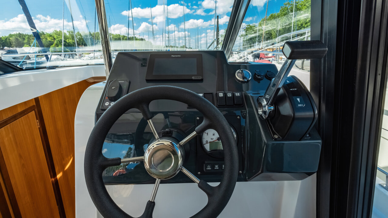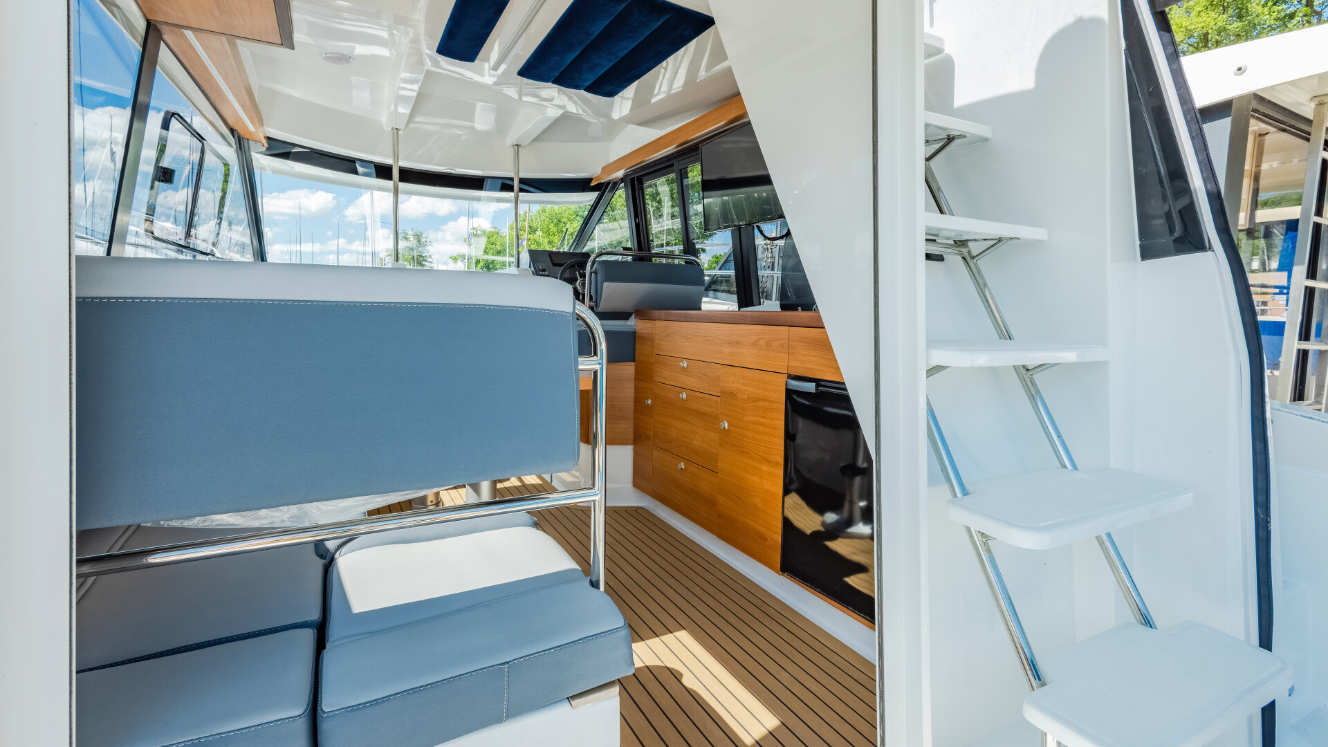 Na dachu znajduje się Flybridge z drugim stanowiskiem sterowym i przestrzenią do wypoczynku. Wewnętrzna sterówka ma boczne wyjście na pokład i dobrą widoczność.