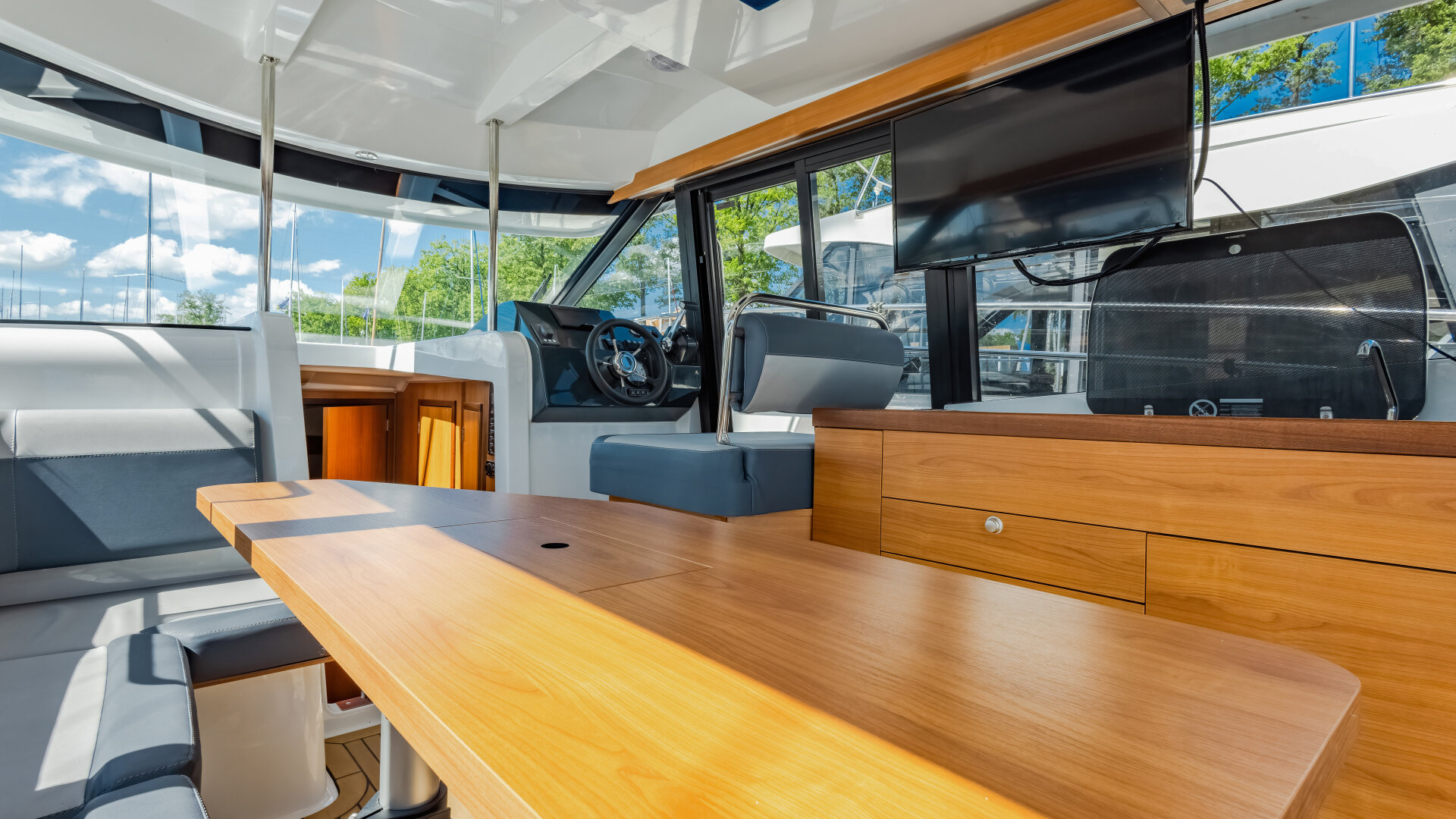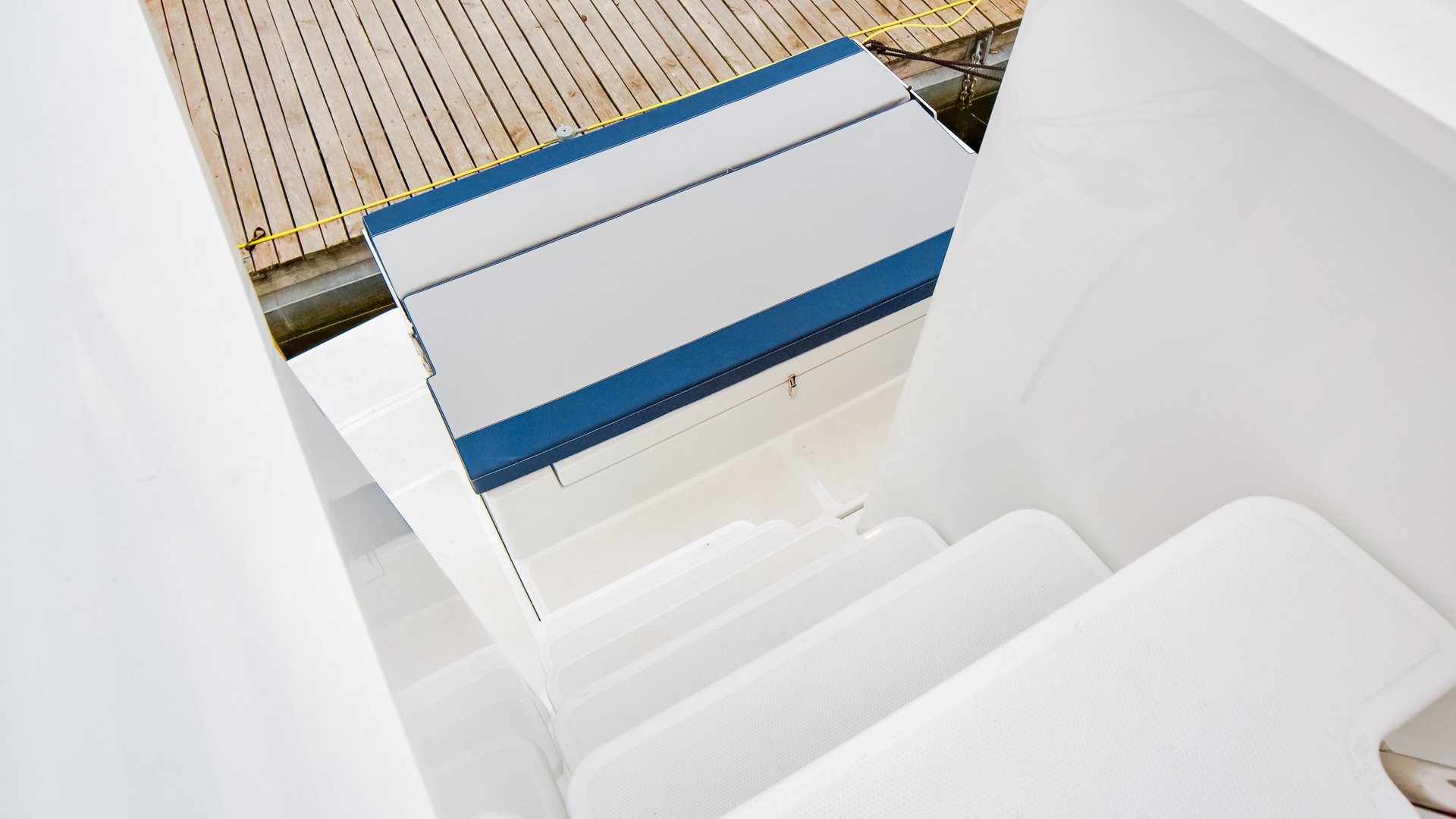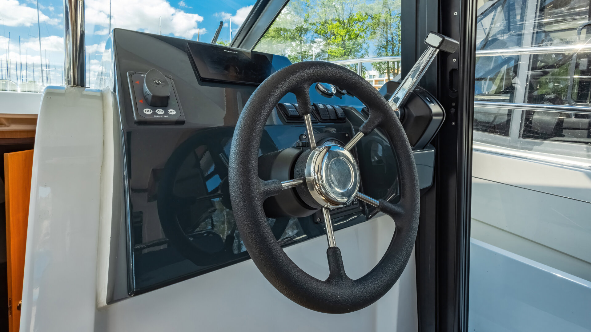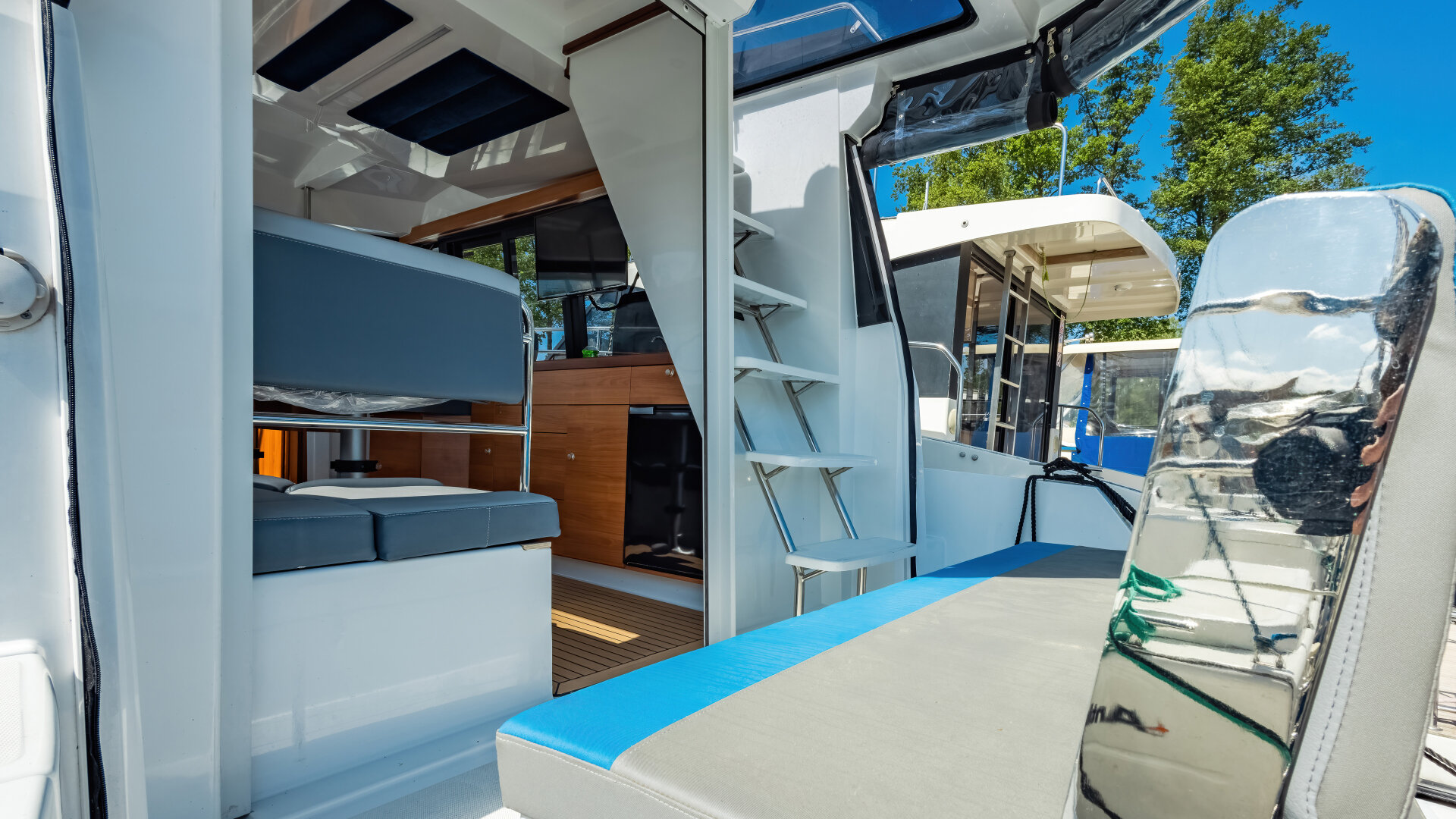 Na dachu znajduje się Flybridge z drugim stanowiskiem sterowym i przestrzenią do wypoczynku. Wewnętrzna sterówka ma boczne wyjście na pokład i dobrą widoczność.