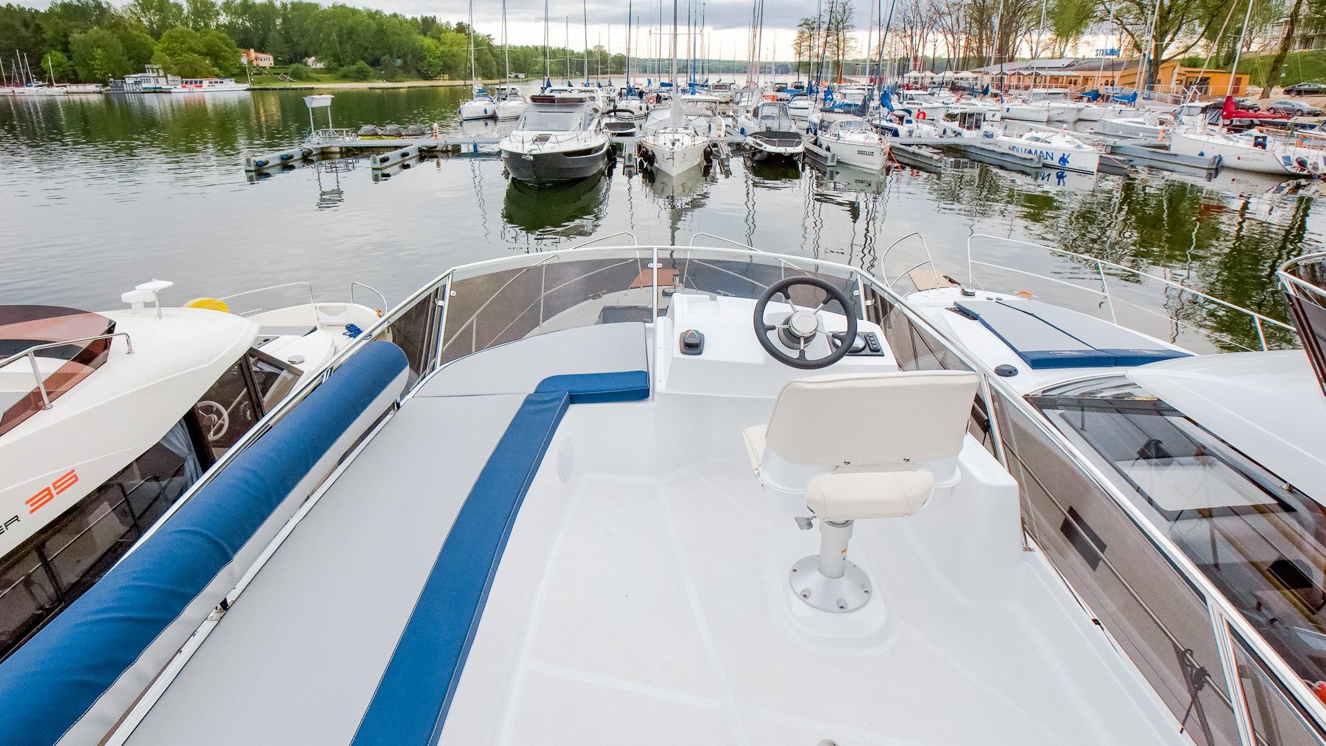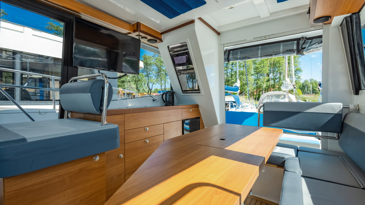 Platinum 35 Fly Active III "Liberta" to wygodny jacht półślizgowy dla 6–8 osób. Idealny na rodzinne rejsy po Mazurach. Ta jednostka wyposażona jest w trzy zamykane kabiny.