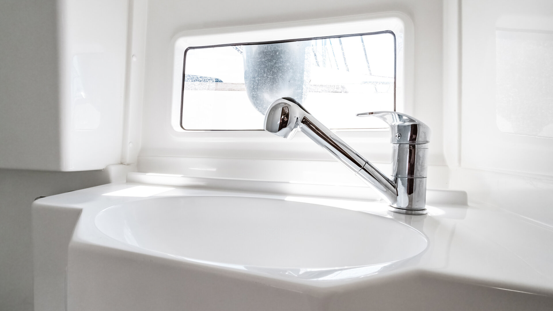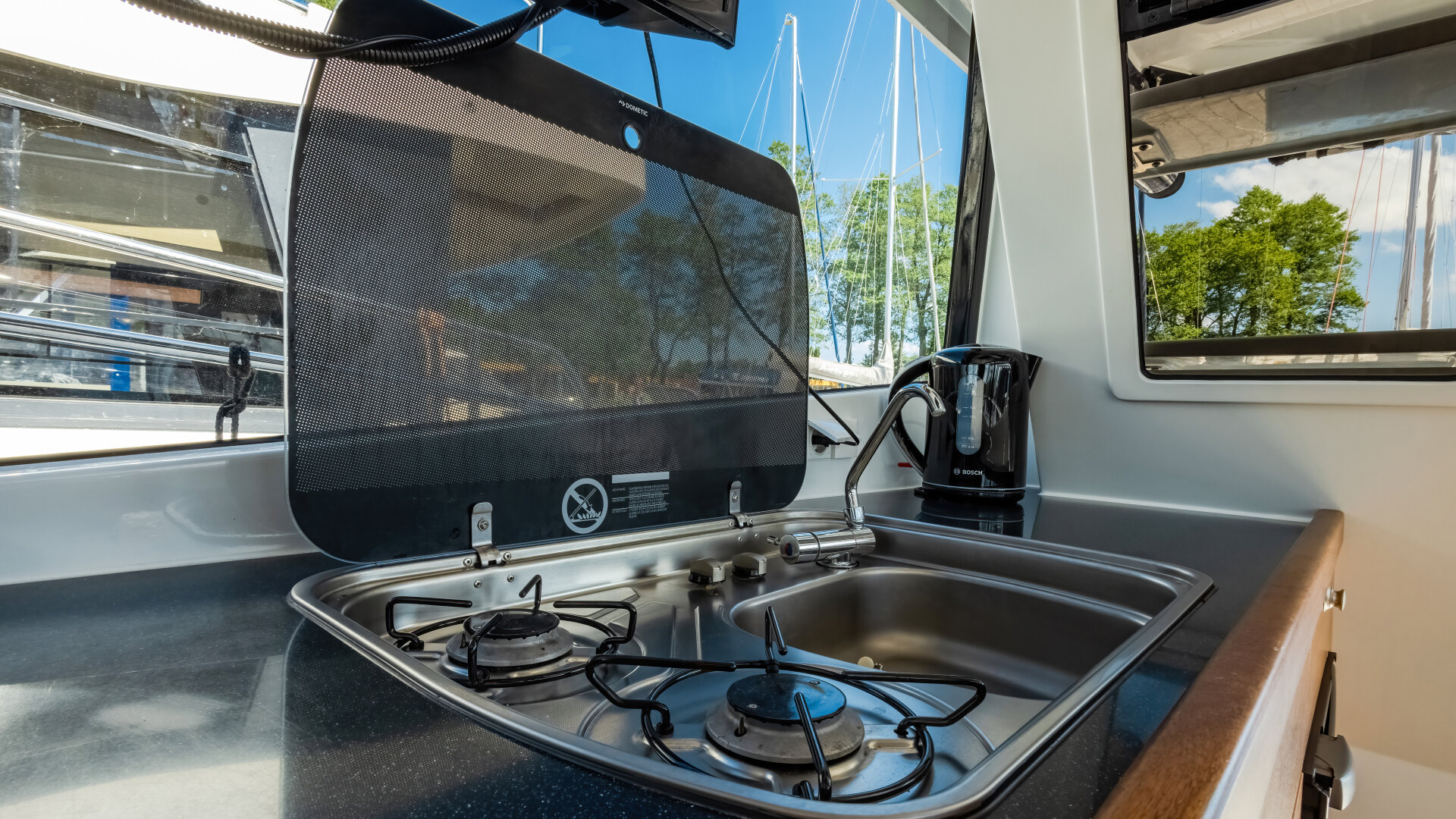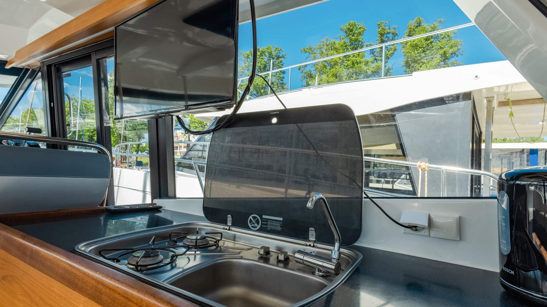• salon z kuchnią (lodówka, kuchenka, zlew) i kanapą z rozkładanym stołem (możliwość dodatkowej koi)