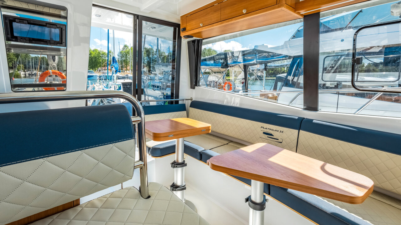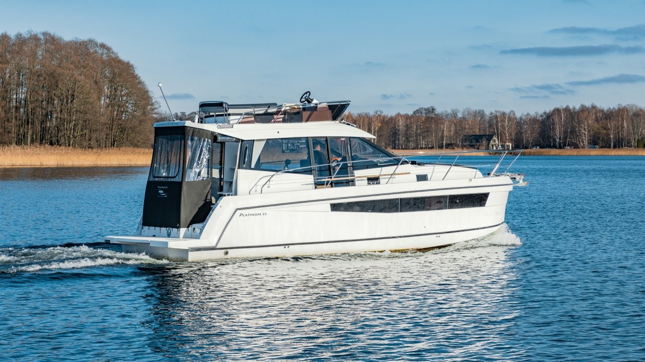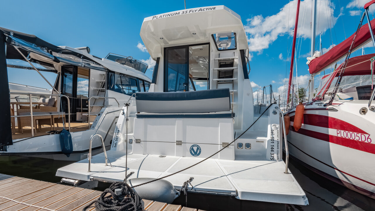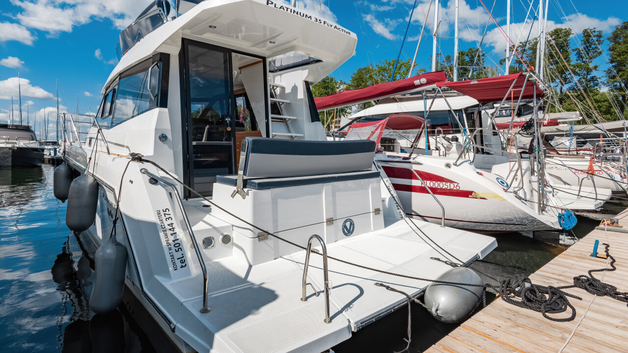 Platinum 35 Fly Active V "Aurora" to wygodny jacht półślizgowy dla 8–10 osób. Idealny na rodzinne rejsy po Mazurach. Ta jednostka wyposażona jest w cztery zamykane kabiny.