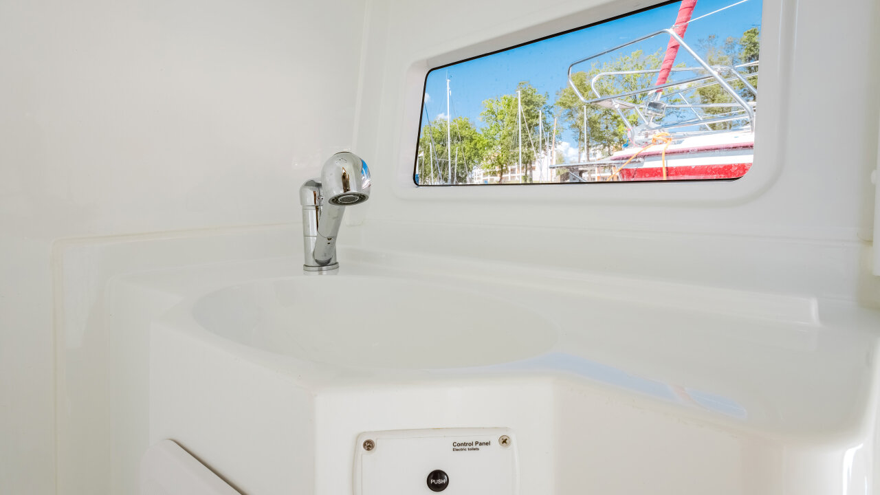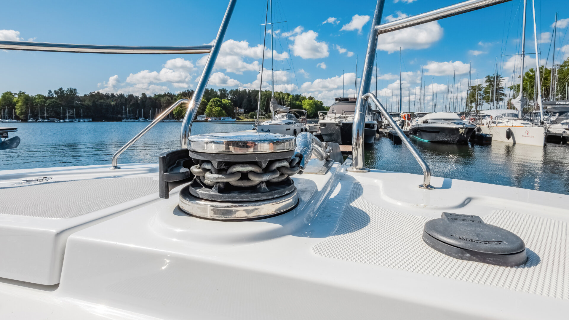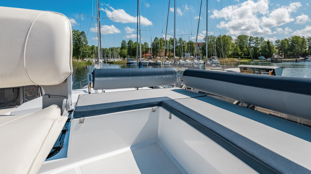 Jednostka jest stabilna i bezpieczna, z szerokimi burtami i relingami. Czarter możliwy bez patentu, ale rekomendujemy podstawowe uprawnienia.