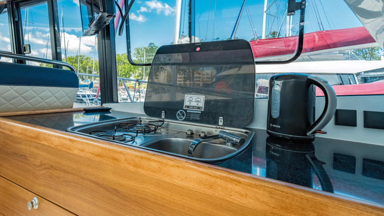 • salon z kuchnią (lodówka, kuchenka, zlew) i kanapą z rozkładanym stołem (możliwość dodatkowej koi)