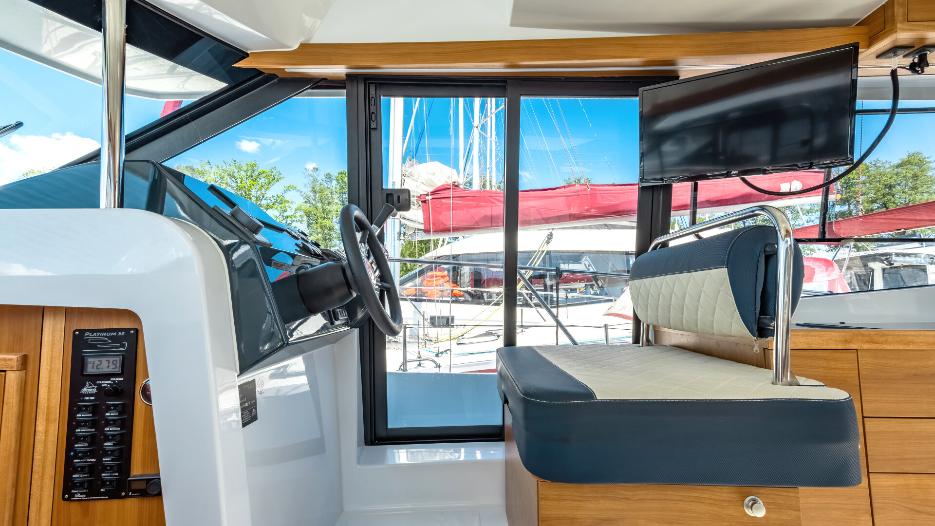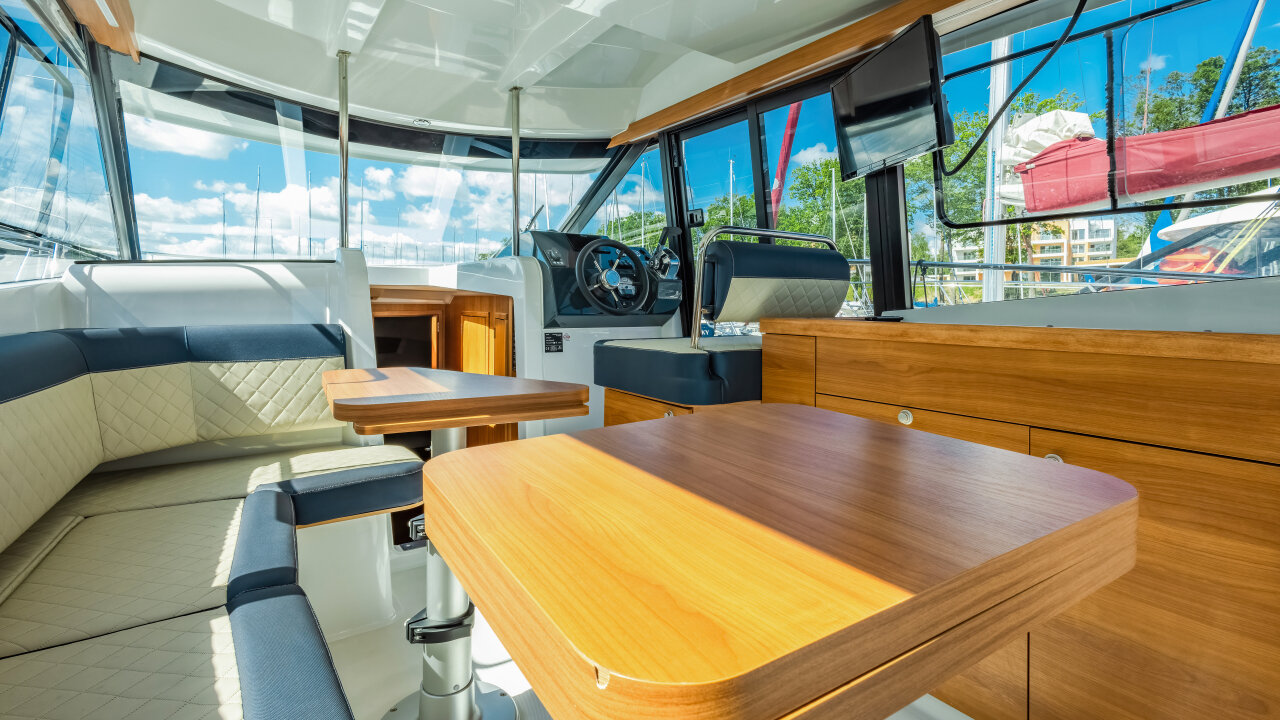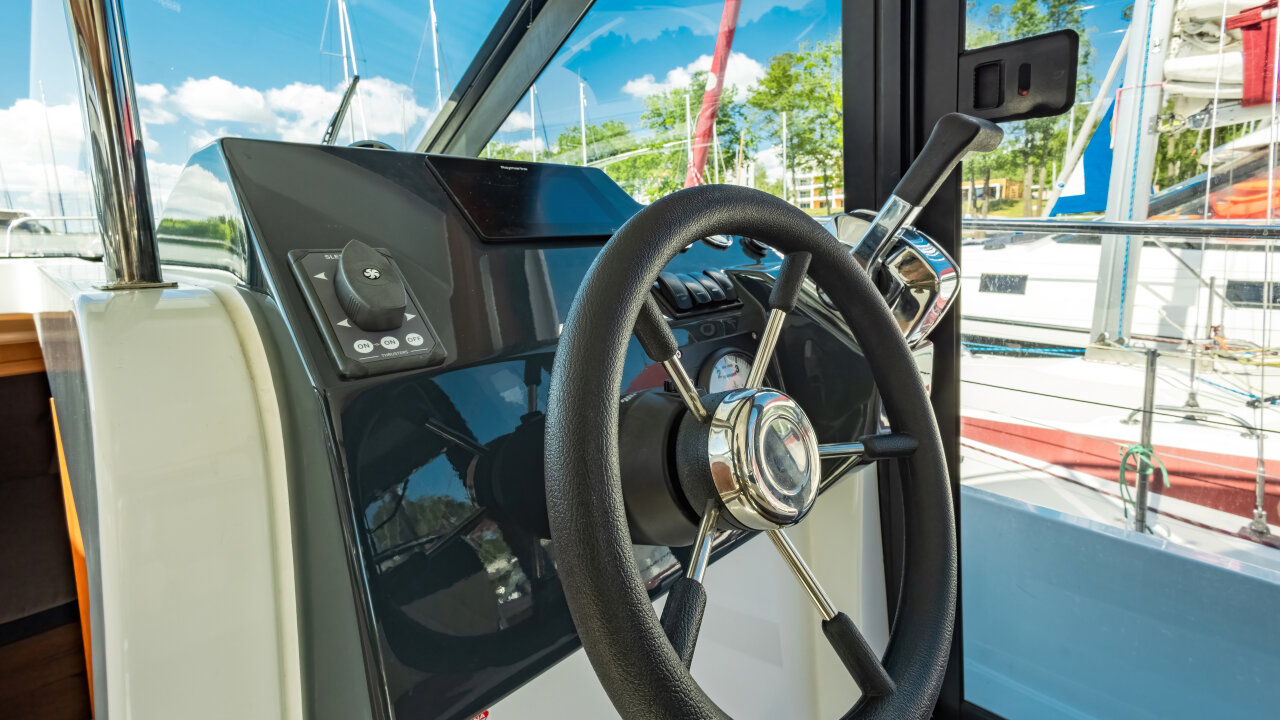 Na dachu znajduje się Flybridge z drugim stanowiskiem sterowym i przestrzenią do wypoczynku. Wewnętrzna sterówka ma boczne wyjście na pokład i dobrą widoczność.
