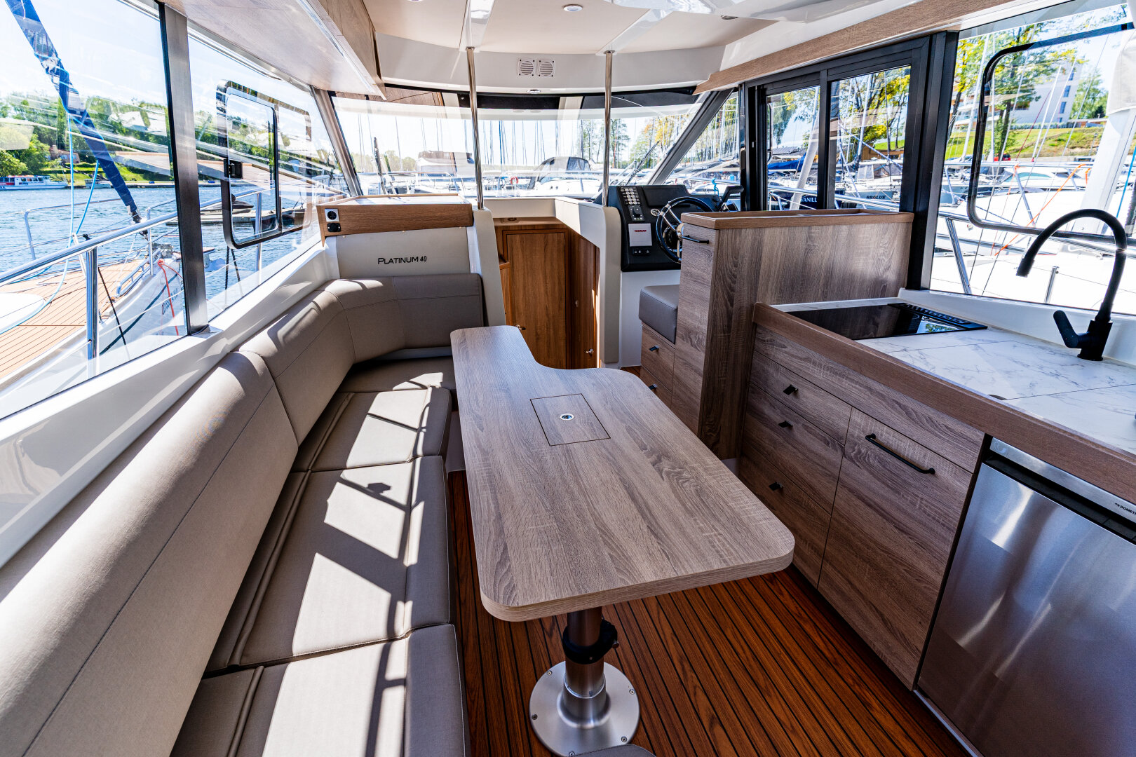 Nie zapomnieliśmy również o bogatym wyposażeniu. Sercem tej jednostki jest niezawodny silnik Yanmar 110HP. Przy manewrowaniu pomagają trzy stery strumieniowe (dwa na rufie, jeden na dziobie), a w nawigacji plotter Raymarine Axiom 9. W kambuzie znajdą Państwo gazową płytę, pojemną lodówkę 115L oraz kostkarkę i ekspres na kapsułki.