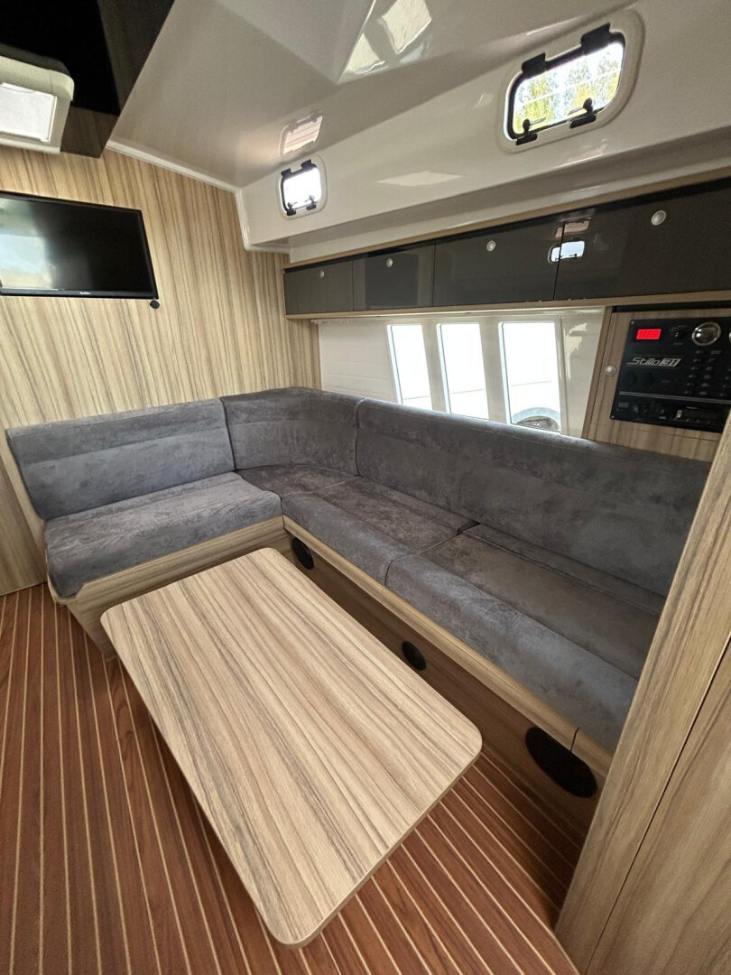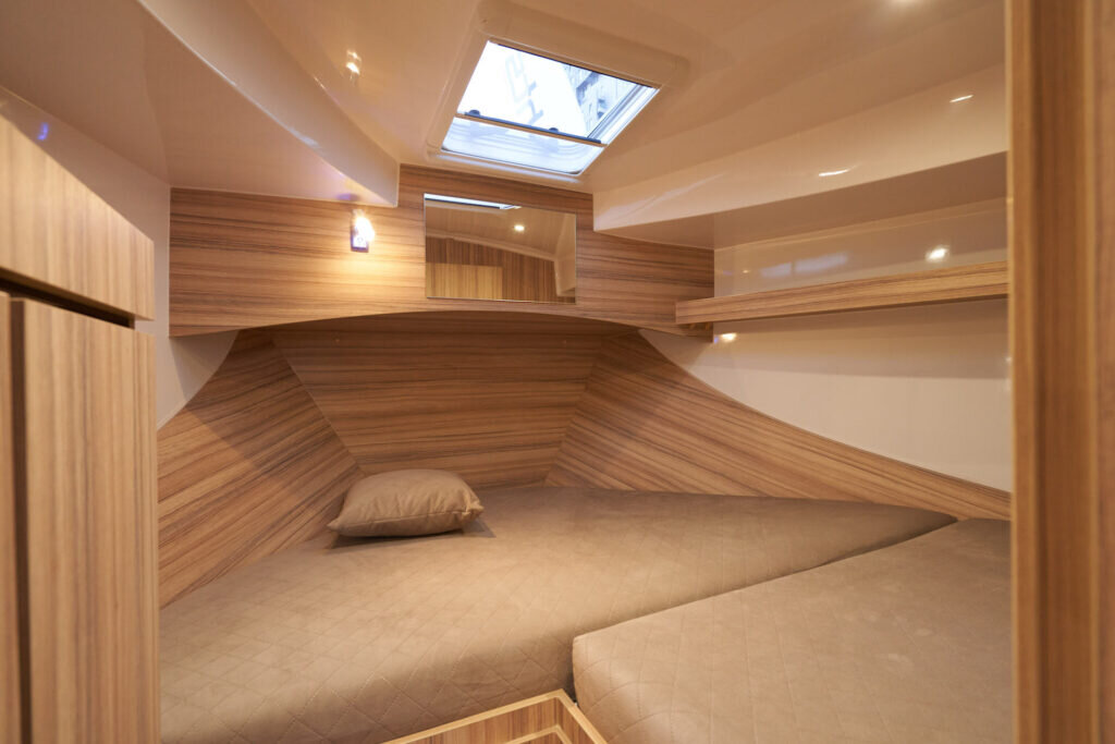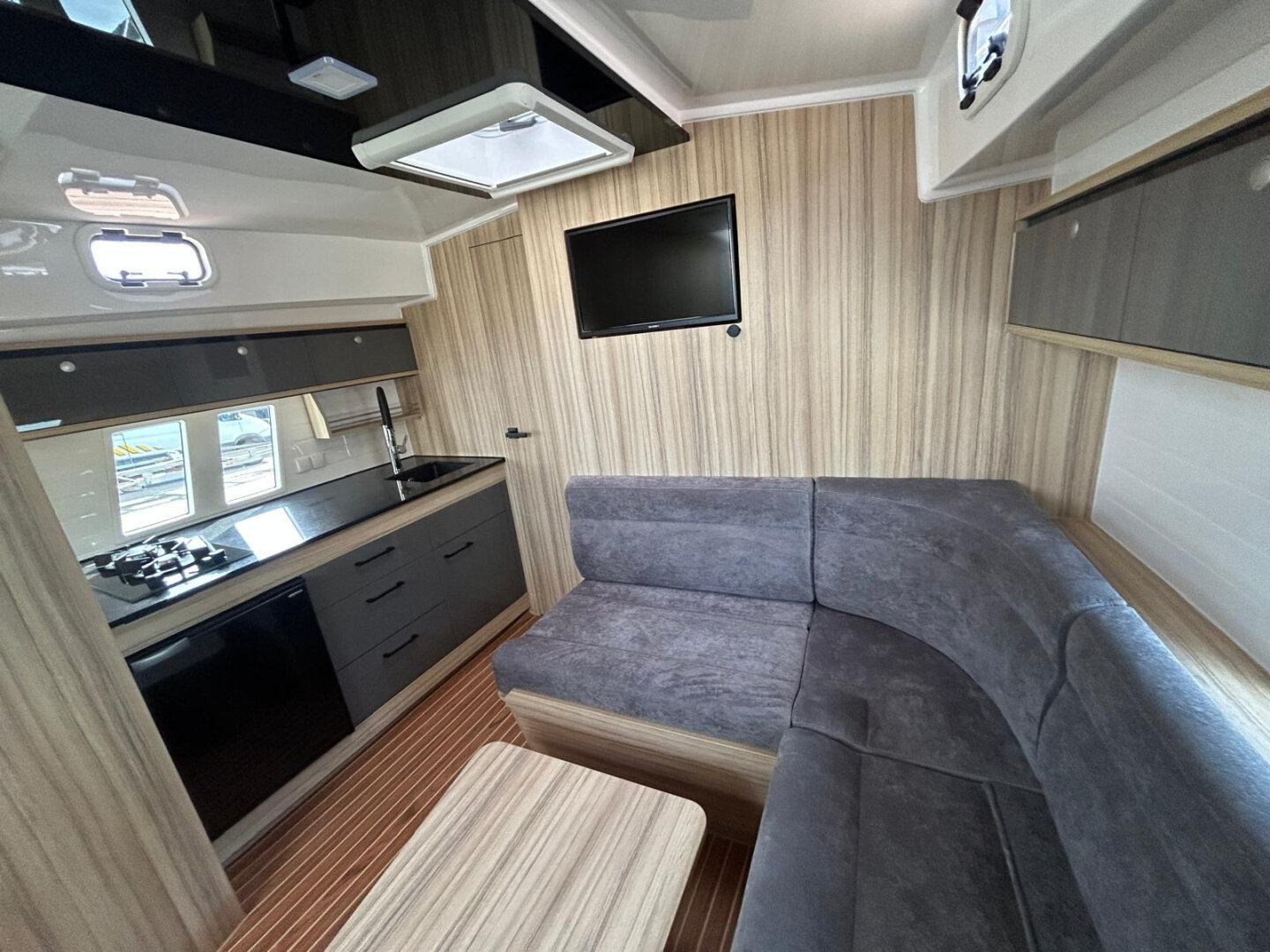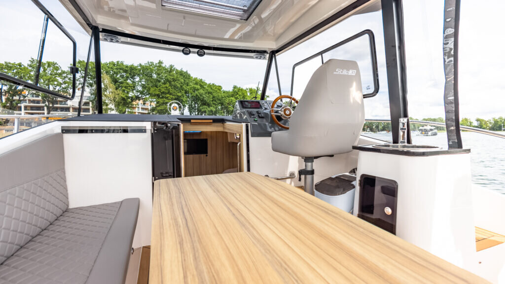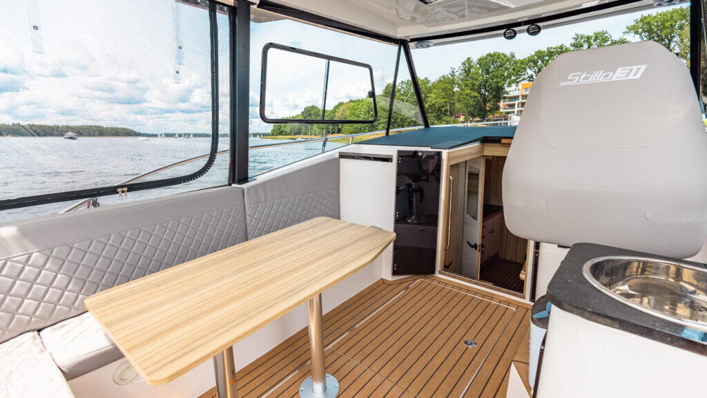 W kokpicie bez trudu siada sześć osób. Szeroka rufowa kanapa i wyjmowany stół tworzą wygodne miejsce do wspólnych posiłków, a dobrze rozplanowane stanowisko sternika daje poczucie kontroli i wygody podczas prowadzenia jachtu. Na dziobie znajduje się duży materac „sundeck”, świetny do opalania i odpoczynku w trakcie postoju. Szerokie półpokłady ułatwiają swobodne poruszanie się po pokładzie.