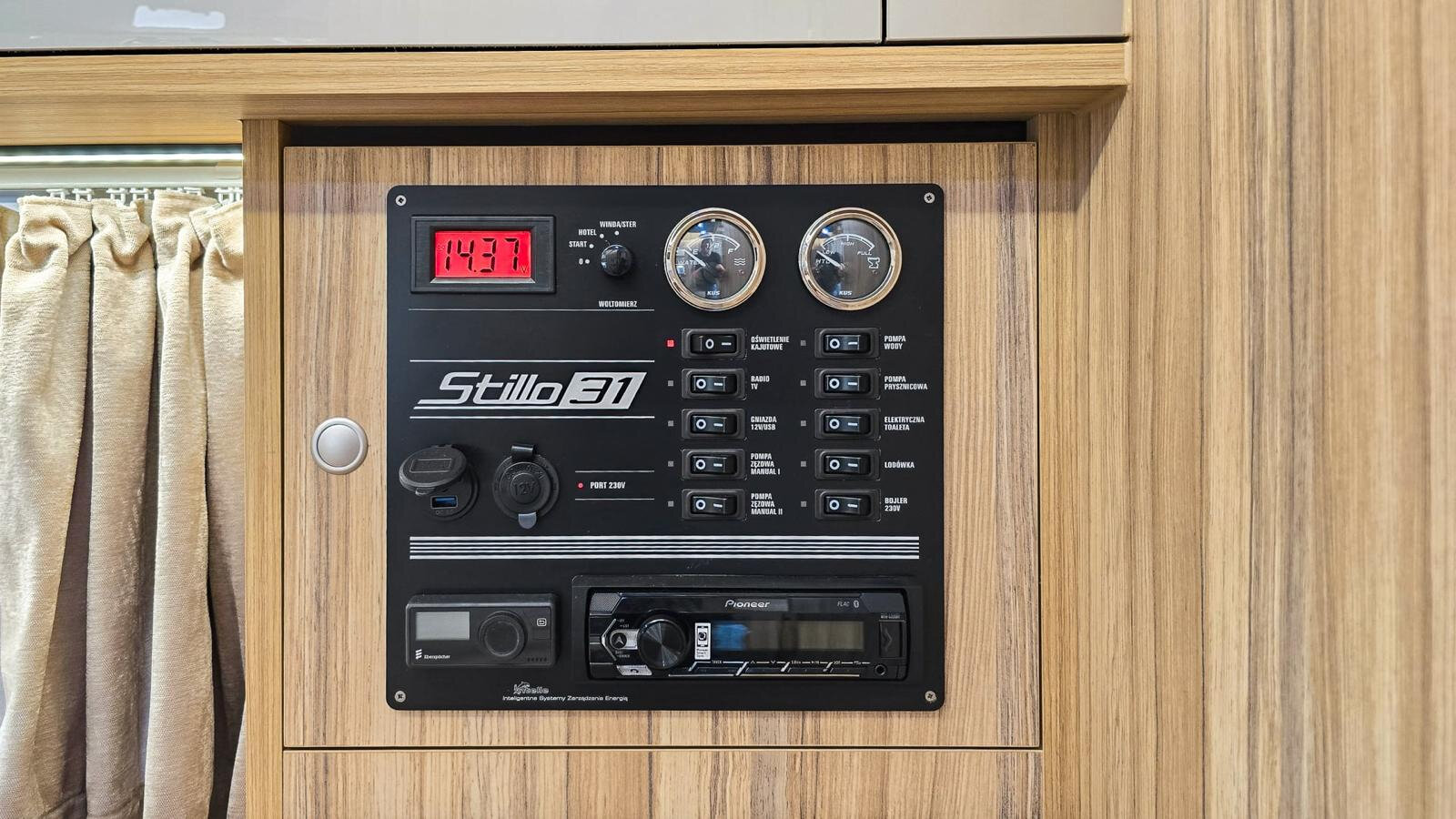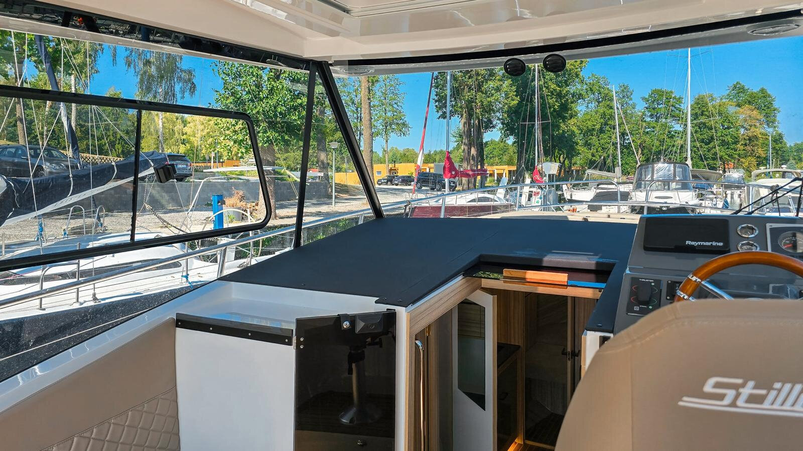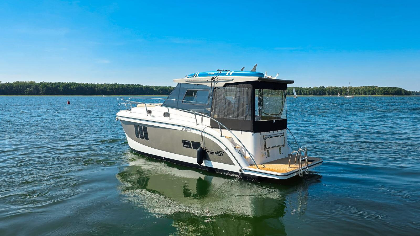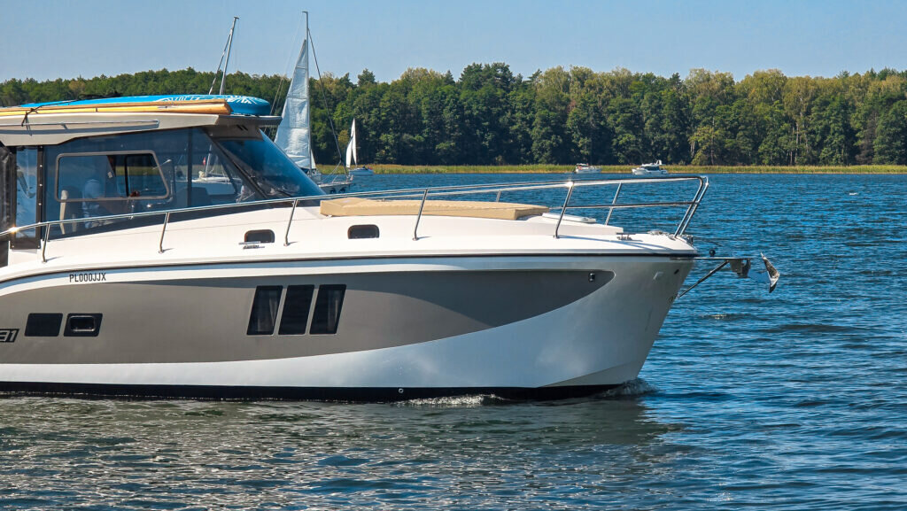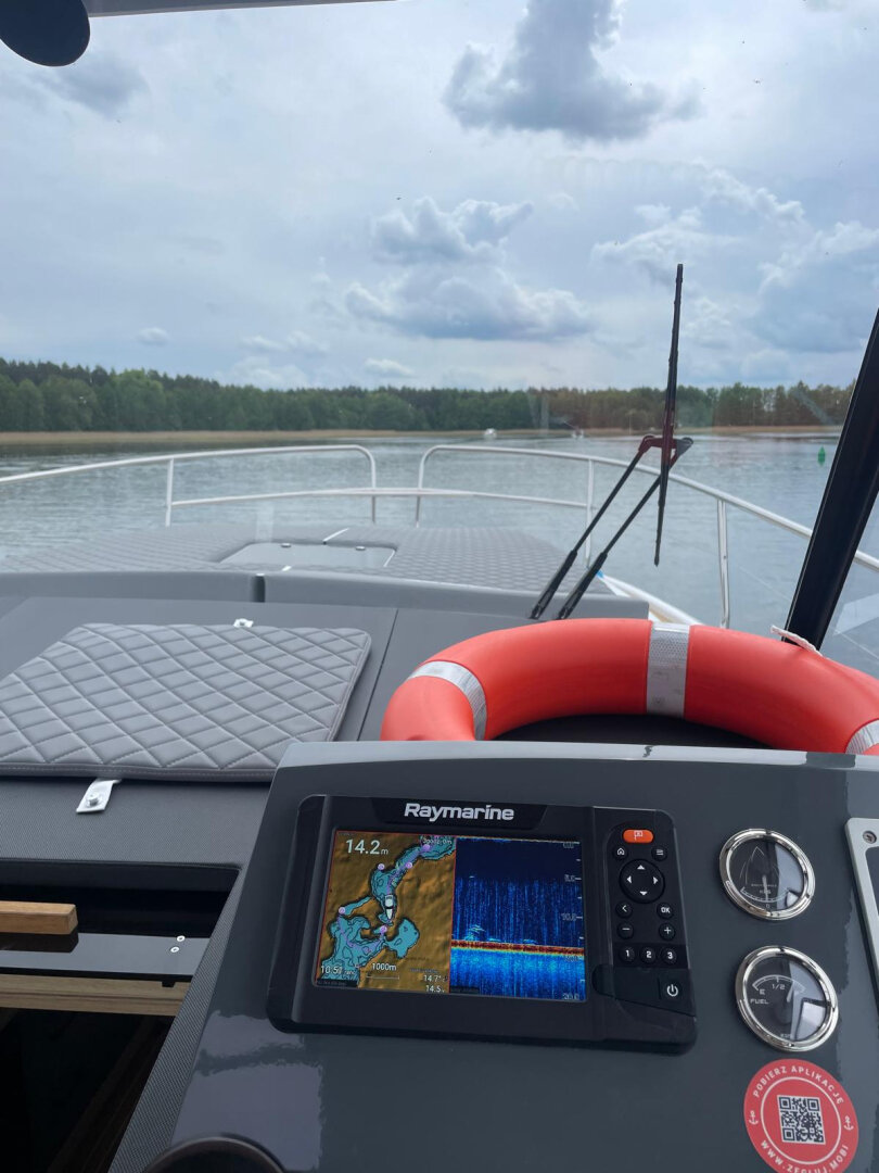Jednostka prowadzi się pewnie i stabilnie. Dwa stery strumieniowe znacząco ułatwiają manewry w portach, a optymalnie dobrana moc silnika pozwala płynąć spokojnie i przewidywalnie. Jacht sprawdzi się także w rękach mniej doświadczonych sterników, którzy chcą cieszyć się żeglugą bez stresu. Ploter z echosondą i aktualnymi mapami Mazur dodatkowo podnosi bezpieczeństwo i wygodę planowania trasy.