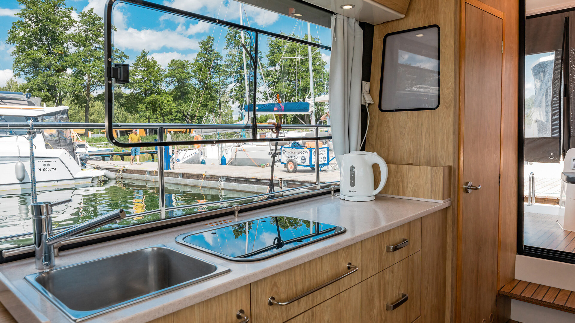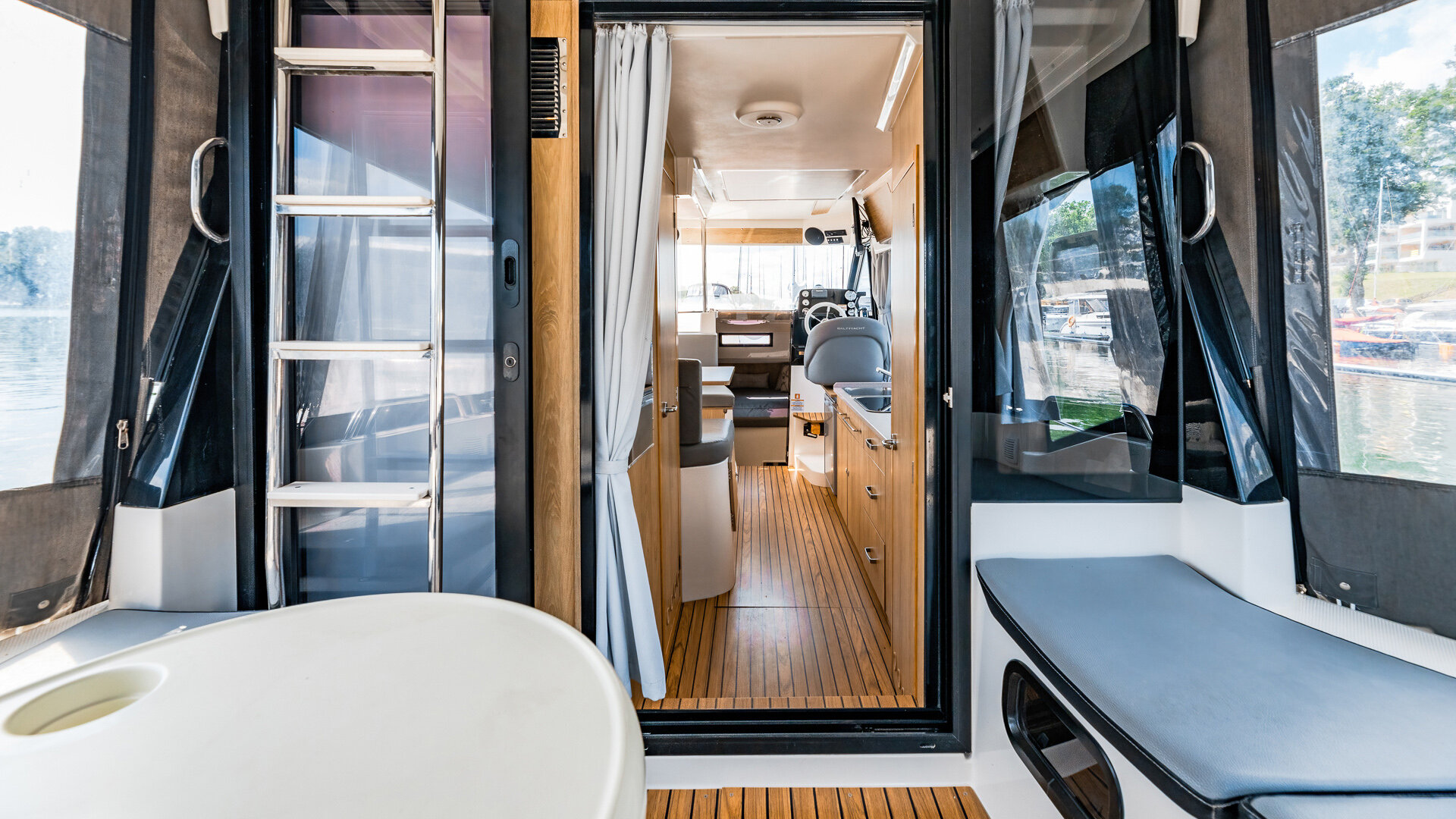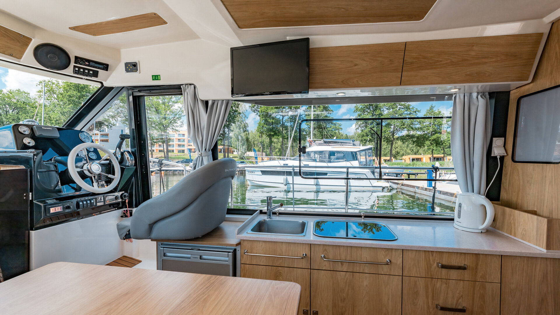 W jachcie zaprojektowano wygodny kokpit salonowy z kambuzem. Jest to rozwiązanie, które zapewnia jeszcze więcej radości ze wspólnego spędzania czasu na wodzie. Pełne przeszklenie kokpitu pozwala na bezpieczne żeglowanie i podziwiane widoków niezalenie od warunków pogodowych. Na dachu jachtu znajduje się Flybridge ze zdublowanym stanowiskiem sterowym.