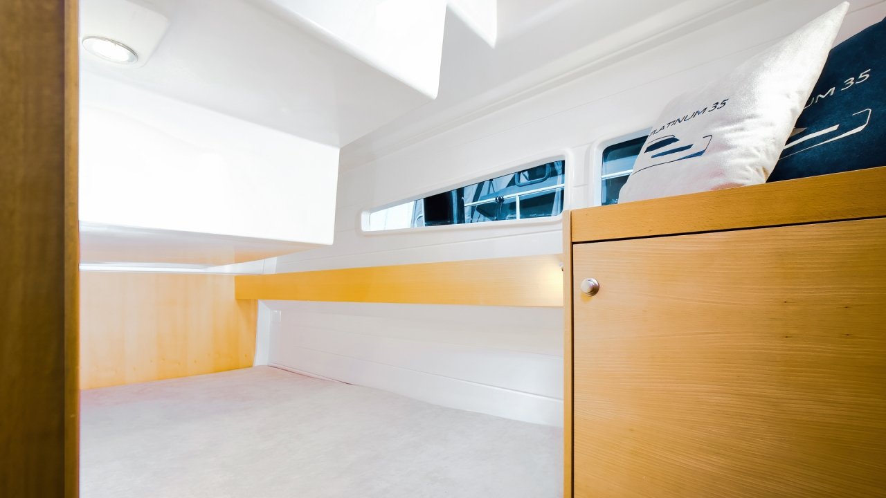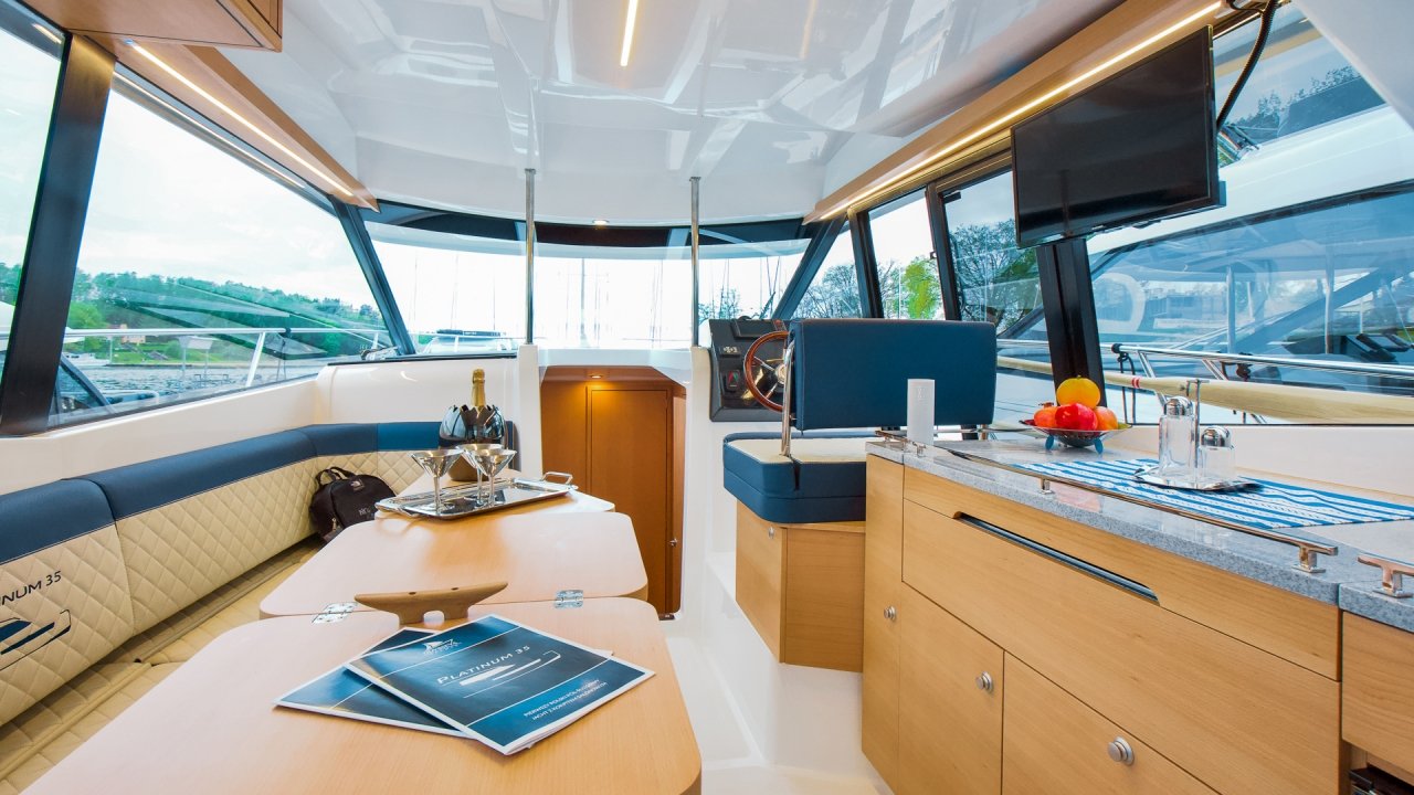 Platinum 35 Fly Active to pierwszy półślizgowy jacht, w którym przestrzeń wewnętrzna została podzielona na część nocną i dzienną. Część dzienna to kokpit salonowy otoczony przejrzystymi panoramicznymi oknami zapewniającymi świetną widoczność. Znajdą tutaj Państwo przestronny kambuz, wyposażony w zamykaną, dwupalnikową kuchenkę gazową, pojemną lodówkę z zamrażarką oraz zlewozmywak. W szafkach i szufladach pomieszczą się wszystkie niezbędne napoje oraz prowiant dla całej załogi. Na przeciwnej burcie znajduje się wygodne miejsce do siedzenia z kanapą w kształcie litery „U” oraz rozkładanym teleskopowym stolikiem, który może służyć jako dodatkowa koja. Obok kambuza usytuowane jest miejsce dla sternika, z wygodnym dwuosobowym regulowanym siedziskiem oraz bezpośrednim bocznym wyjściem na pokład, dającym dobrą widoczność oraz możliwość komunikacji z załogą na pokładzie. Sama sterówka wyposażona jest w najwyższej klasy przyrządy nawigacyjne oraz sterowe. Znajdują się tam również panele umożliwiające sterowanie wszystkimi systemami i urządzeniami jak, lampy nawigacyjne, szperacz czy winda kotwiczna.