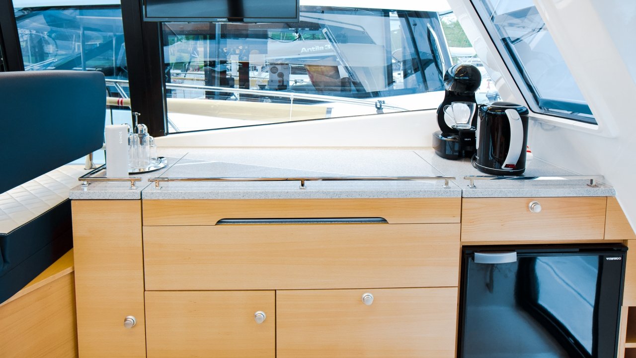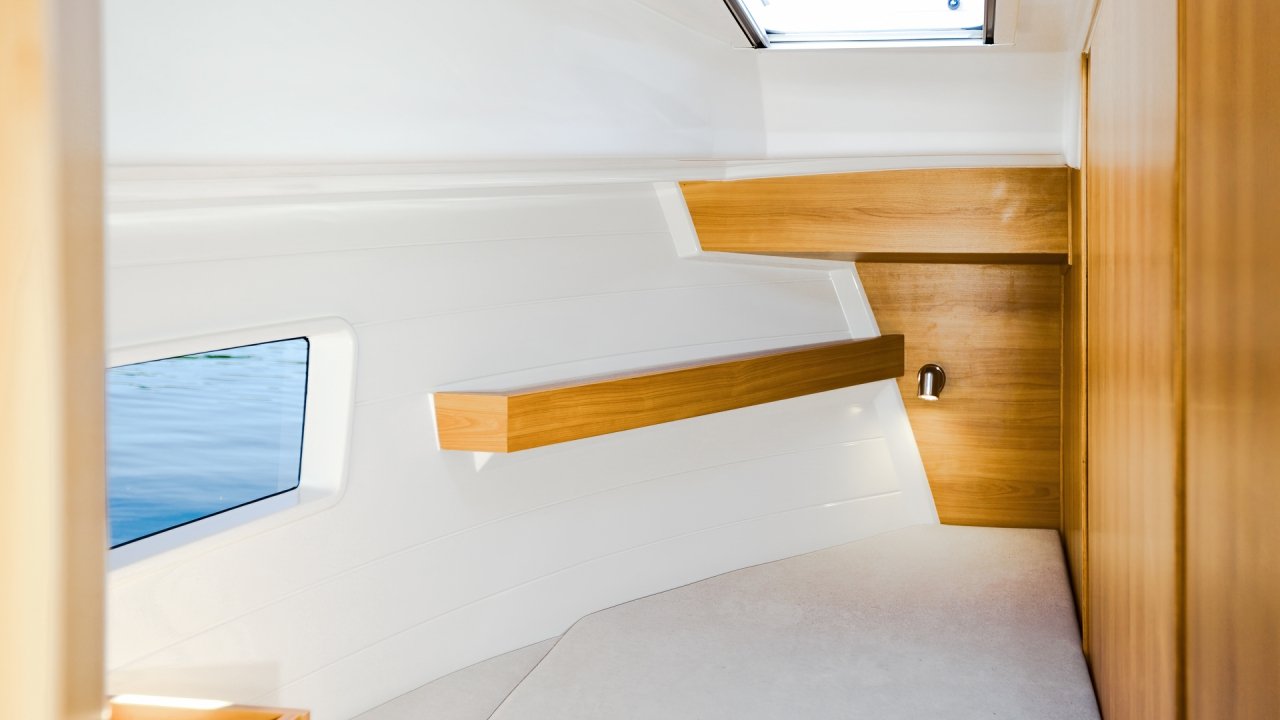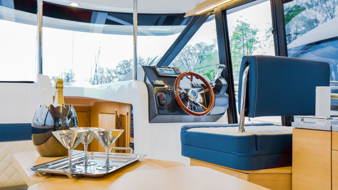 to pierwszy półślizgowy jacht, w którym przestrzeń wewnętrzna została podzielona na część nocną i dzienną. Część dzienna to kokpit salonowy otoczony przejrzystymi panoramicznymi oknami zapewniającymi świetną widoczność. Znajdą tutaj Państwo przestronny kambuz, wyposażony w zamykaną, dwupalnikową kuchenkę gazową, pojemną lodówkę z zamrażarką oraz zlewozmywak. W szafkach i szufladach pomieszczą się wszystkie niezbędne napoje oraz prowiant dla całej załogi. Na przeciwnej burcie znajduje się wygodne miejsce do siedzenia z kanapą w kształcie litery „U” oraz rozkładanym teleskopowym stolikiem, który może służyć jako dodatkowa koja. Obok kambuza usytuowane jest miejsce dla sternika, z wygodnym dwuosobowym regulowanym siedziskiem oraz bezpośrednim bocznym wyjściem na pokład, dającym dobrą widoczność oraz możliwość komunikacji z załogą na pokładzie. Sama sterówka wyposażona jest w najwyższej klasy przyrządy nawigacyjne oraz sterowe. Znajdują się tam również panele umożliwiające sterowanie wszystkimi systemami i urządzeniami jak, lampy nawigacyjne, szperacz czy winda kotwiczna.